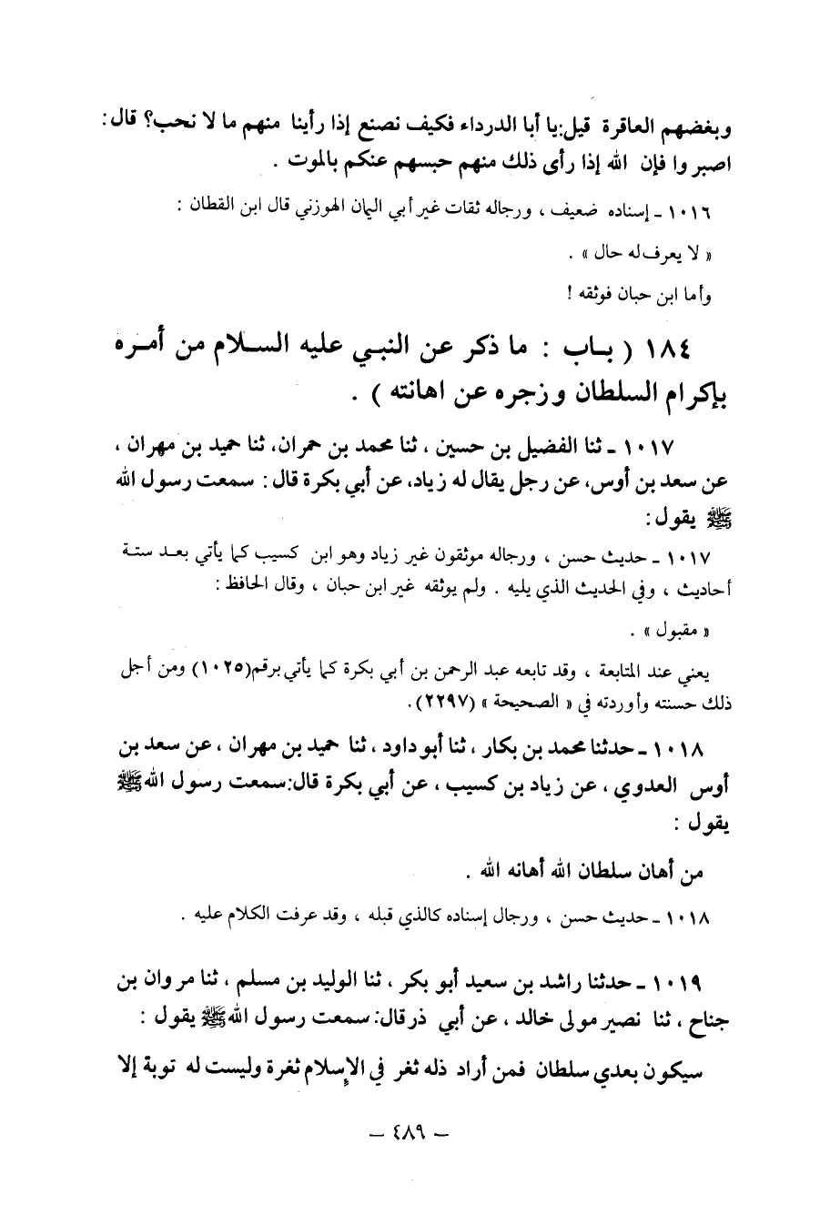 184- بَابُ: مَا ذُكِرَ عَنِ النَّبِيِّ عَلَيْهِ السَّلامُ مِنْ أَمْرِهِ بِإِكْرَامِ السُّلْطَانِ وَزَجْرِهِ عَنْ إِهَانَتِهِ: