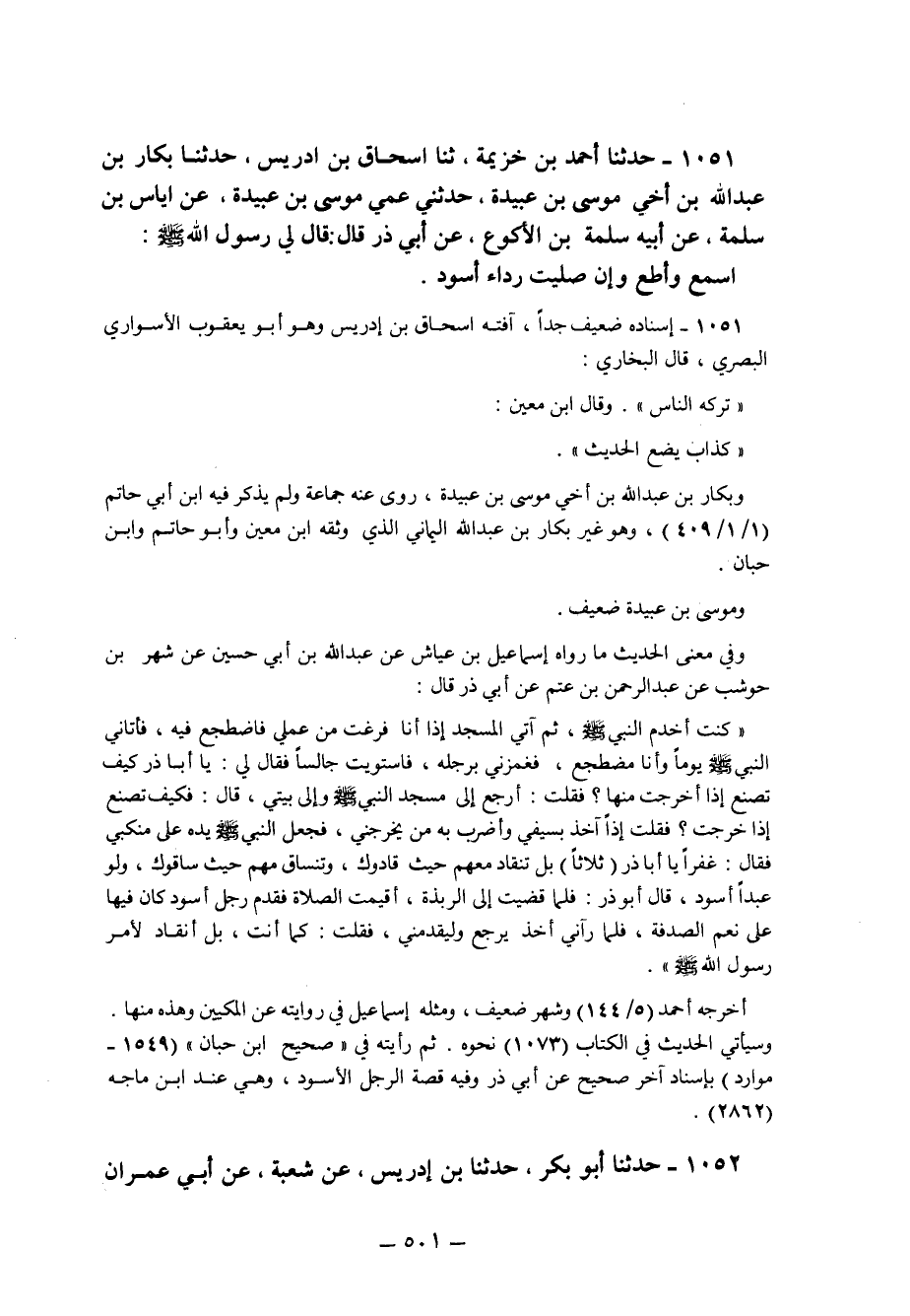 1051 - حَدَّثَنَا أَحْمَدُ بْنُ خُزَيْمَةَ ثنا إِسْحَاقُ بْنُ إِدْرِيسَ حَدَّثَنَا بَكَّارُ بن عبد الله بن أَخِي مُوسَى بْنِ عُبَيْدَةَ حَدَّثَنِي عَمِّي مُوسَى بْنُ عُبَيْدَةَ عَنْ إِيَاسِ بْنِ سَلَمَةَ عَنْ أَبِيهِ سَلَمَةَ بْنِ الأَكْوَعِ عَنْ أَبِي ذَرٍّ قَالَ: قَالَ لِي رَسُولُ اللَّهِ صَلَّى اللَّهُ عَلَيْهِ وَسَلَّمَ: