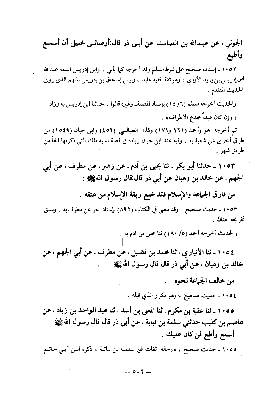 الجوني عن عبد الله ابن الصَّامِتِ عَنْ أَبِي ذَرٍّ قَالَ: أَوْصَانِي خَلِيلِي أَنْ أَسْمَعَ وَأُطِيعَ.