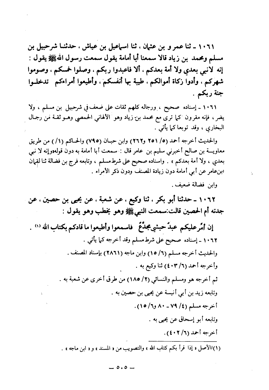 1061 - ثنا عَمْرُو بْنُ عُثْمَانَ ثنا إِسْمَاعِيلُ بْنُ عَيَّاشٍ حَدَّثَنَا شُرَحْبِيلُ بن مسلم ومحمد ابن زِيَادٍ قَالا: سَمِعْنَا أَبَا أُمَامَةَ يَقُولُ: سَمِعْتُ رَسُولَ اللَّهِ صَلَّى اللَّهُ عَلَيْهِ وَسَلَّمَ يَقُولُ: "إِنَّهُ لا نَبِيَّ بَعْدِي وَلا أُمَّةَ بَعْدَكُمْ أَلا فَاعْبُدُوا رَبَّكُمْ وَصَلَّوْا خَمْسَكُمْ وَصُومُوا شَهْرَكُمْ وَأَدُّوا زَكَاةَ أَمْوَالِكُمْ طَيِّبَةً بِهَا أَنْفُسُكُمْ وَأَطِيعُوا أمراءكم تدخلوا جنة ربكم".