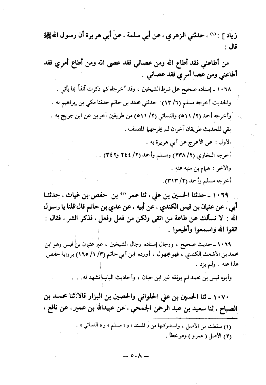 1069 - حدثنا الحسين بْنُ عَلِيٍّ ثنا عُمَرُ2 بْنُ حَفْصِ بْنِ غِيَاثٍ حَدَّثَنَا أَبِي عَنْ عُثْمَانَ بْنِ قَيْسٍ الْكِنْدِيِّ عَنْ أَبِيهِ عَنْ عَدِيِّ بْنِ حَاتِمٍ قَالَ: قُلْنَا يَا رَسُولَ اللَّهِ: لا نَسْأَلُكَ عَنْ طَاعَةِ مَنِ اتَّقَى وَلَكِنْ مَنْ فَعَلَ وَفَعَلَ فَذَكَرَ الشَّرَّ فَقَالَ: "اتَّقُوا الله واسمعوا وأطيعوا".