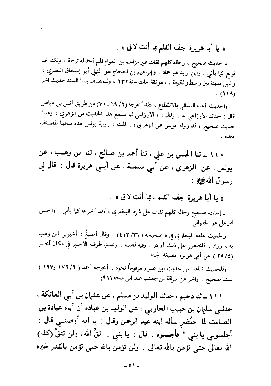 111- ثنا دُحَيْمٌ حَدَّثَنَا الْوَلِيدُ بْنُ مُسْلِمٍ عَنْ عُثْمَانَ بْنِ أَبِي الْعَاتِكَةِ حَدَّثَنِي سُلَيْمَانُ بْنُ حَبِيبٍ الْمُحَارِبِيُّ عَنِ الْوَلِيدِ بْنِ عُبَادَةَ أَنَّ أَبَاهُ عُبَادَةَ بْنَ الصَّامِتِ لما اختصر سَأَلَهُ ابْنُهُ عَبْدُ الرَّحْمَنِ وَقَالَ: يا أبه أوصتني قَالَ: أَجْلِسُونِي يَا بَنِيَّ! فَأَجْلَسُوهُ. قَالَ: يَا بُنَيَّ اتَّقِ اللَّهَ ولن تتق "كذا" اللَّهَ تَعَالَى حَتَّى تُؤْمِنَ بِاللَّهِ تَعَالَى. وَلَنْ تُؤْمِنَ بِاللَّهِ حَتَّى تُؤْمِنَ بِالْقَدَرِ خَيْرِهِ