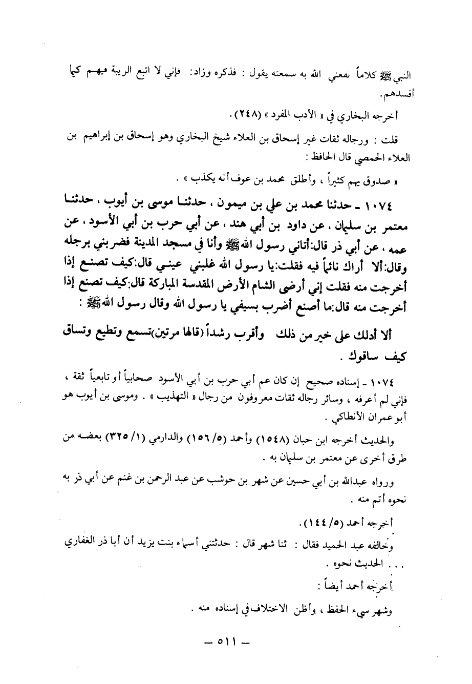 1074- إسناده صحيح إن كان عم أَبِي حَرْبِ بْنِ أَبِي الأَسْوَدِ صحابيا أو تابعيا ثقة فإني لم أعرفه وسائر رجاله ثقات معرفون من رجال التهذيب وموسى بن أيوب هو أبو عمران الأنطاكي.
