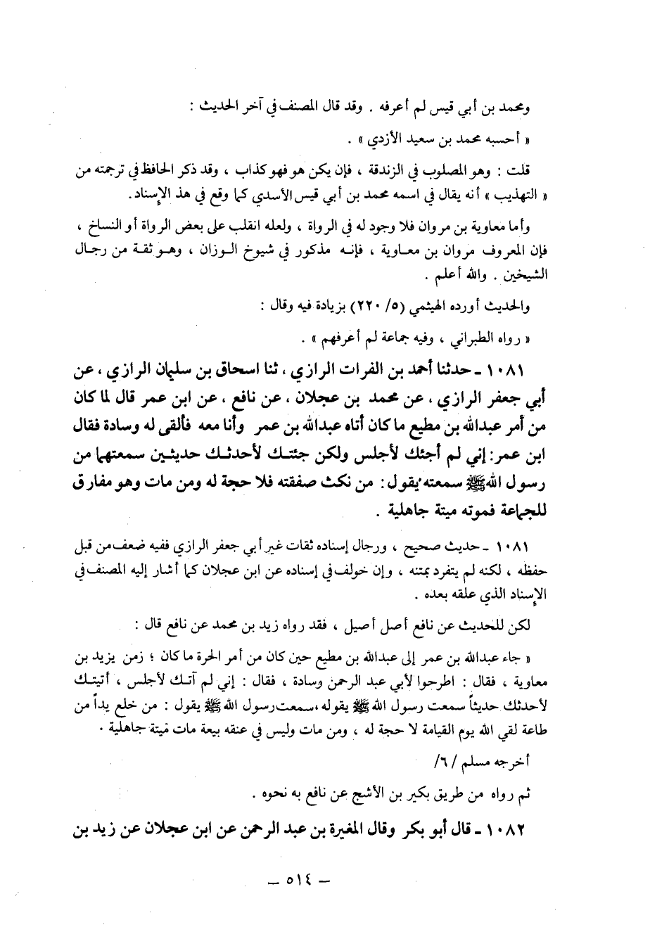 1081 - حَدَّثَنَا أَحْمَدُ بْنُ الْفُرَاتِ الرَّازِيُّ ثنا إِسْحَاقُ بْنُ سُلَيْمَانَ الرَّازِيُّ عَنْ أَبِي جَعْفَرٍ الرَّازِيِّ عَنْ مُحَمَّدِ بْنِ عَجْلانَ عَنْ نَافِعٍ عَنِ ابْنِ عُمَرَ قَالَ: لَمَّا كان من أمر عبد الله بْنِ مُطِيعٍ مَا كَانَ أَتَاهُ عبد الله بْنُ عُمَرَ وَأَنَا مَعَهُ فَأَلْقَى لَهُ وِسَادَةً فَقَالَ ابْنُ عُمَرَ: إِنِّي لَمْ أَجِئْكَ لأَجْلِسَ وَلَكِنْ جِئْتُكَ لأُحَدِّثَكَ حَدِيثَيْنِ سَمِعْتُهُمَا مِنْ رَسُولُ اللَّهِ صَلَّى اللَّهُ عَلَيْهِ وَسَلَّمَ سَمِعْتُهُ يَقُولُ: "مَنْ نَكَثَ صَفْقَتَهُ فَلا حُجَّةَ لَهُ وَمَنْ مَاتَ وَهُوَ مُفَارِقٌ لِلْجَمَاعَةِ فَمَوْتُهُ ميتة جاهلية".