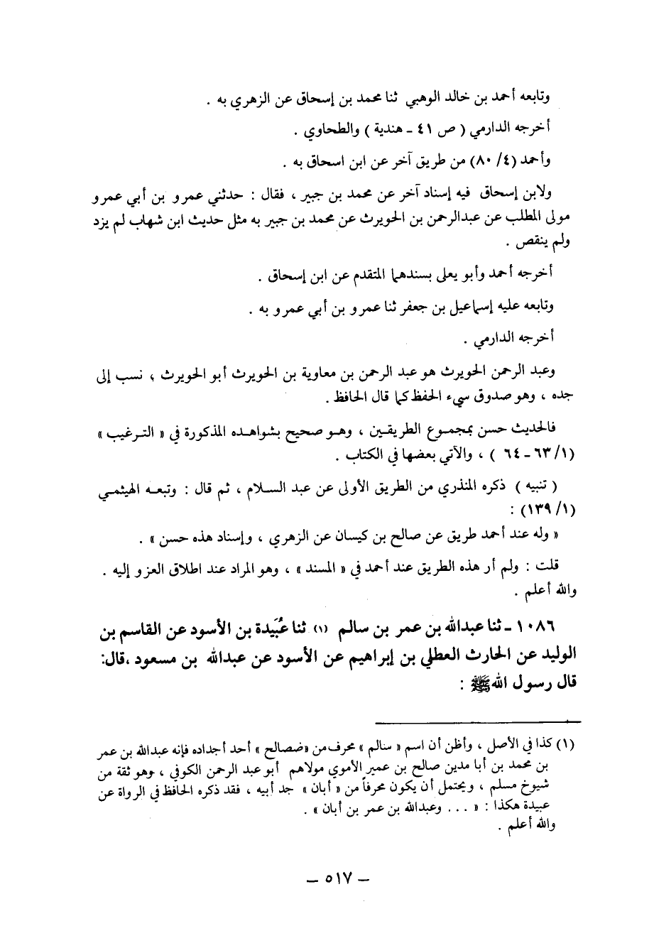 1- كذا في الأصل وأظن أن اسم سالم محرف من ضصالح أحد أجداده فإنه عبد الله بن عمر بن محمد بن أبا مدين صالح بن عمير الأموي مولاهم أبو عيد الرحمن الكوفي وهوثقة من شيوخ مسلم ويحتمل أن يكون محرفا من أبان جد أبيه فقد ذكره الحافظ في الرواة عن عبيد الله هكذا: وعبد الله بن عمر بن أبان. والله أعلم.