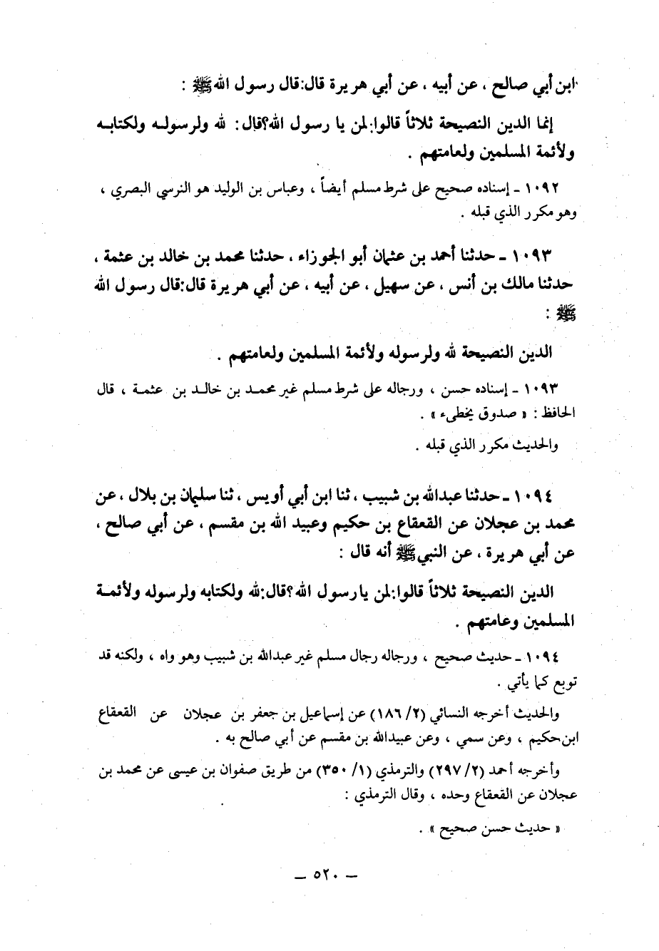 "إِنَّمَا الدِّينُ النَّصِيحَةُ" ثَلاثًا قَالُوا لِمَنْ يَا رَسُولَ اللَّهِ؟ قَالَ: "لِلَّهِ وَلِرَسُولِهِ وَلِكِتَابِهِ وَلأَئِمَّةِ الْمُسْلِمِينَ ولعامتهم".