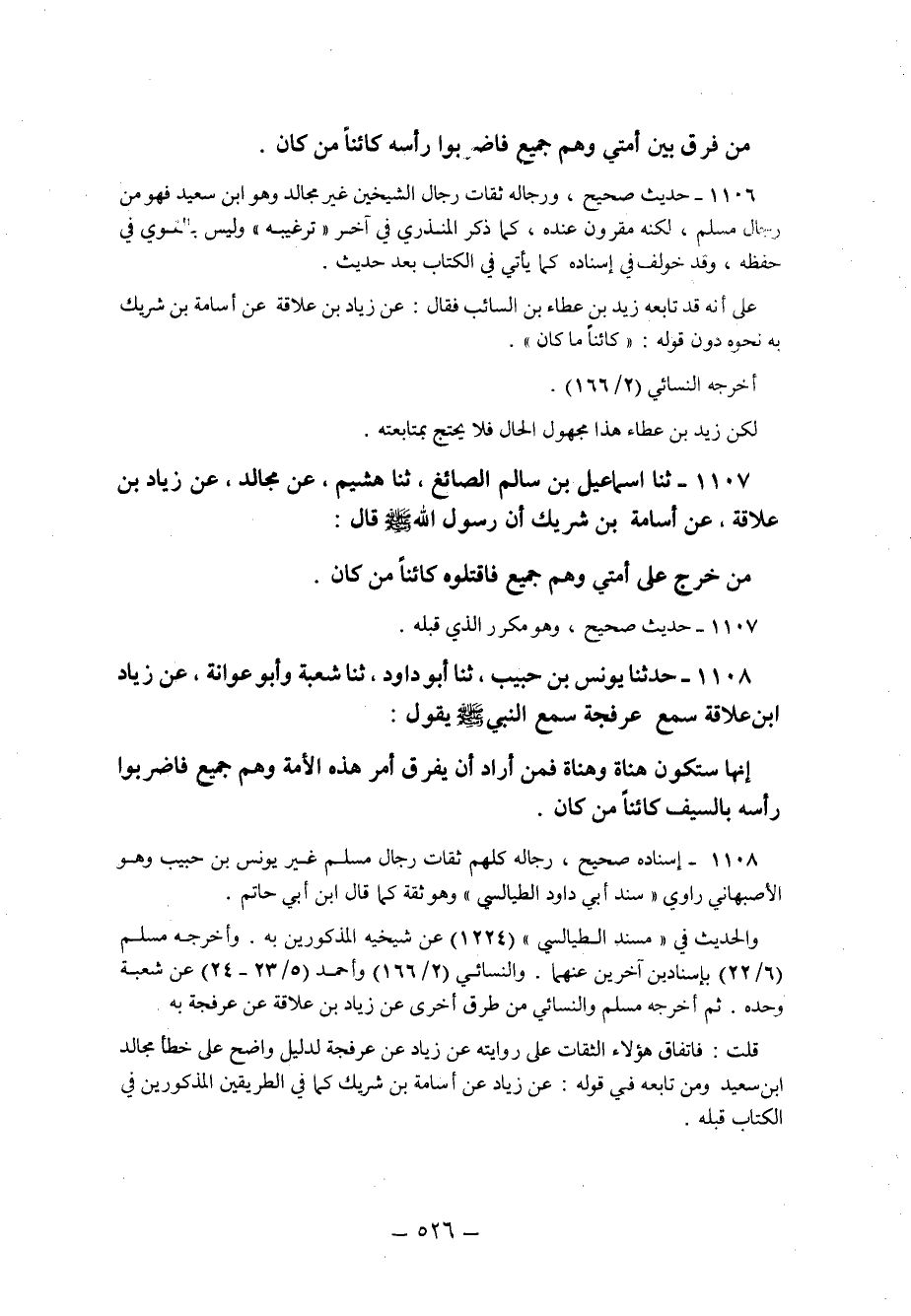 قلت: فاتفاق هؤلاء الثقات على روايته عن زياد عن عرفجة لدليل واضح على خطأ مجالد ابن سعيد ومن تابعه في قوله عن زياد عن أسامة بن شريك كما في الطريقين المذكورين في الكتاب قبله.