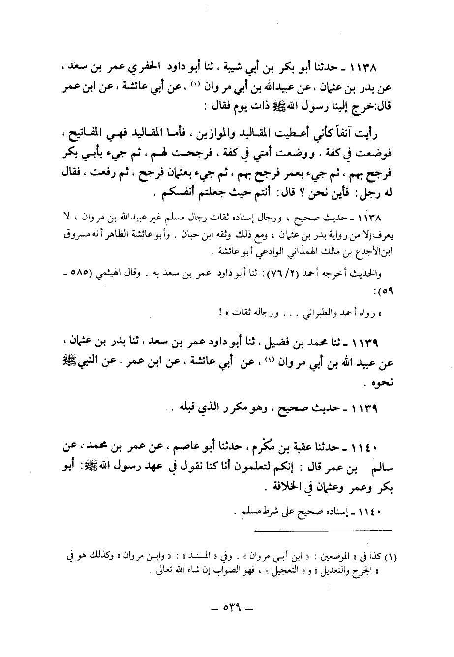 1138- حديث صحيح ورجال إسناده ثقات رجال مسلم غير عبيد الله بن مروان لا يعرف إلا من رواية بدر بن عثمان ومع ذلك وثقه ابن حبان وأبو عائشة الظاهر أنه مسروق بن الأجدع بن مالك الهمداني الوادعي أبو عائشة.