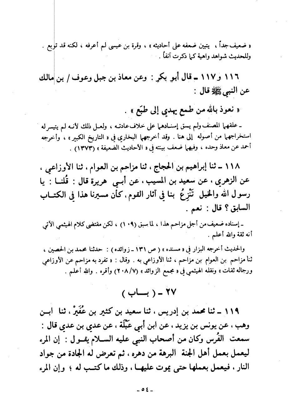 116و117 قَالَ أَبُو بَكْرٍ: وَعَنْ مُعَاذِ بْنِ جَبَلٍ وَعَوْفِ بْنِ مَالِكٍ عَنِ النَّبِيِّ صَلَّى اللَّهُ عَلَيْهِ وَسَلَّمَ قَالَ: