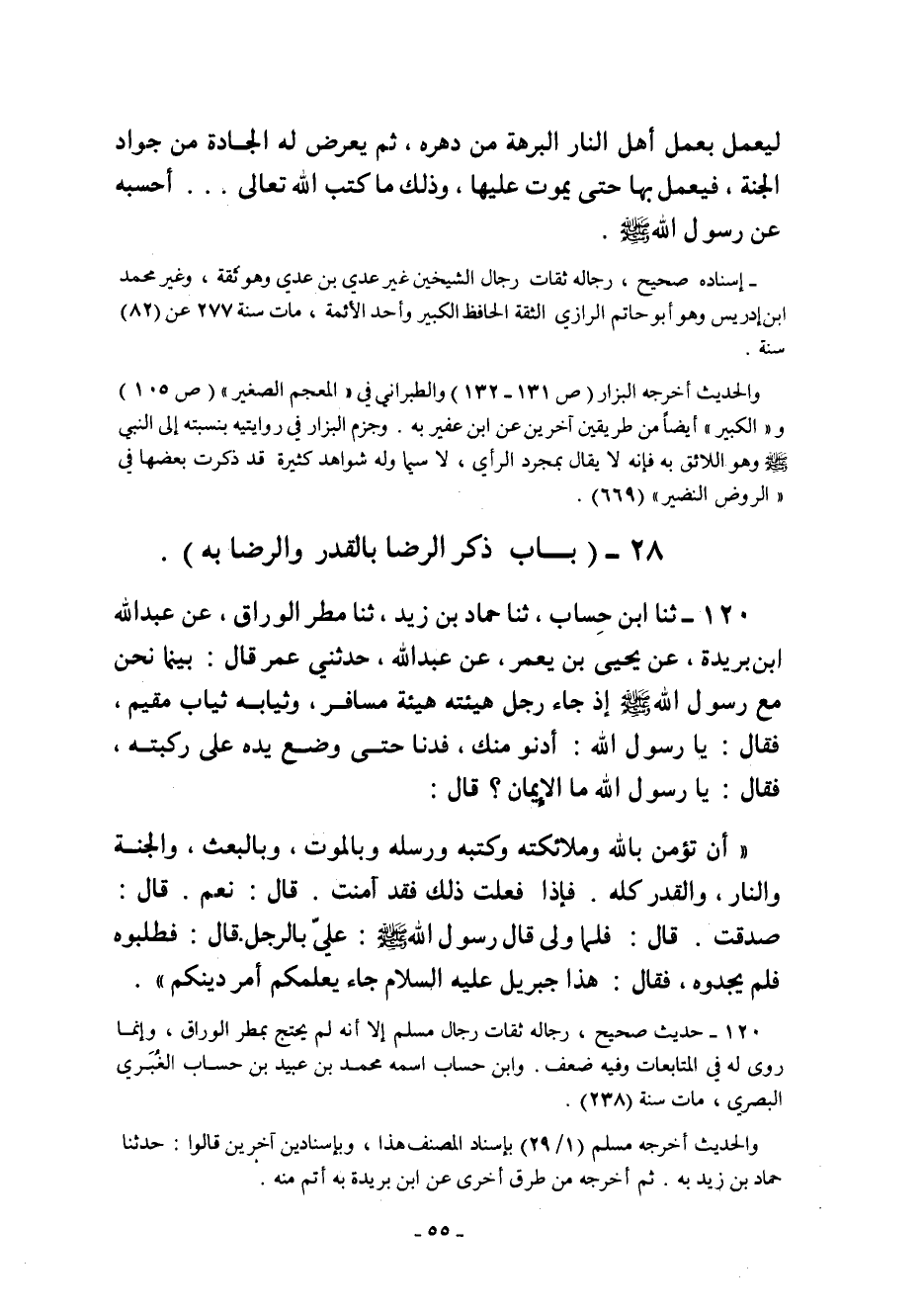 120- ثنا ابْنُ حِسَابٍ ثنا حَمَّادُ بْنُ زَيْدٍ ثنا مَطَرٌ الوراق عن عبد الله بْنِ بُرَيْدَةَ عَنْ يَحْيَى بْنِ يعمر عن عبد الله حَدَّثَنِي عُمَرُ قَالَ: بَيْنَمَا نَحْنُ مَعَ رَسُولِ اللَّهِ صَلَّى اللَّهُ عَلَيْهِ وَسَلَّمَ إِذْ جَاءَ رَجُلٌ هَيْئَتُهُ هَيْئَةُ مُسَافِرٍ وَثِيَابُهُ ثِيَابُ مُقِيمٍ فَقَالَ يَا رَسُولَ اللَّهِ: أَدْنُو مِنْكَ فَدَنَا حَتَّى وَضَعَ يَدَهُ عَلَى رُكْبَتِهِ فَقَالَ يَا رَسُولَ اللَّهِ: مَا الإِيمَانُ؟ قَالَ: "أَنْ تُؤْمِنَ بِاللَّهِ وَمَلائِكَتِهِ وَكُتُبِهِ ورسله وبالموت وبالعبث وَالْجَنَّةِ وَالنَّارِ وَالْقَدَرِ كُلِّهِ. فَإِذَا فَعَلْتَ ذَلِكَ فَقَدْ آمَنْتَ. قَالَ: نَعَمْ. قَالَ: صَدَقْتَ. قَالَ: فَلَمَّا وَلَّى قَالَ رَسُولُ اللَّهِ صَلَّى اللَّهُ عَلَيْهِ وَسَلَّمَ: عَلَيَّ بِالرَّجُلِ. قَالَ: فَطَلَبُوهُ فَلَمْ يَجِدُوهُ. فَقَالَ: هَذَا جِبْرِيلُ عَلَيْهِ السَّلامُ جَاءَ يعلمكم أمر دينكم".