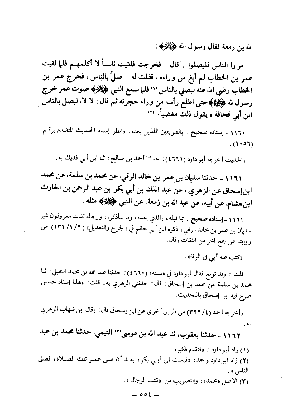 1161 - حَدَّثَنَا سُلَيْمَانُ بْنُ عُمَرَ بْنِ خَالِدٍ الرَّقِّيُّ عَنْ مُحَمَّدِ بْنِ سَلَمَةَ عَنْ مُحَمَّدِ بْنِ إِسْحَاقَ عَنِ الزُّهْرِيِّ عَنْ عَبْدِ الْمَلِكِ بْنِ أَبِي بَكْرِ بْنِ عَبْدِ الرَّحْمَنِ بْنِ الْحَارِثِ بْنِ هِشَامٍ عَنْ أَبِيهِ عَنْ عَبْدِ اللَّهِ بْنِ زَمْعَةَ عَنِ النَّبِيِّ صَلَّى الله عليه وسلم مثله.