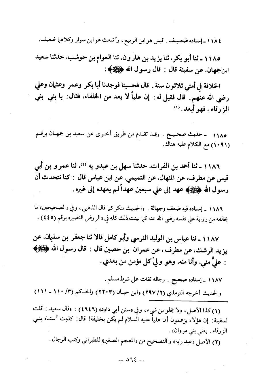 1- كذا في الأصل ولا يخلوا من شيء وفي سنن أبي داود 4646: قال سعيد: قلت: لسفينة: إن هؤلاء يزعمون أن عليا عليه السلام لم يكن بخليفة! قال: كذبت أستاه بني الزرقاء يعني بني مروان.