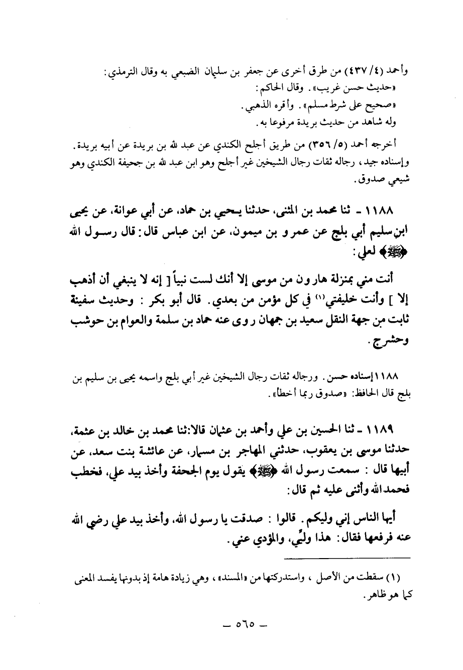 1188 - ثنا مُحَمَّدُ بْنُ الْمُثَنَّى حَدَّثَنَا يَحْيَى بْنُ حَمَّادٍ عَنْ أَبِي عَوَانَةَ عَنْ يَحْيَى بْنِ سُلَيْمٍ أَبِي بَلْجٍ عَنْ عَمْرِو بْنِ مَيْمُونٍ عَنِ ابْنِ عَبَّاسٍ قَالَ: قَالَ رَسُولُ اللَّهِ صَلَّى اللَّهُ عَلَيْهِ وَسَلَّمَ لِعَلِيٍّ: