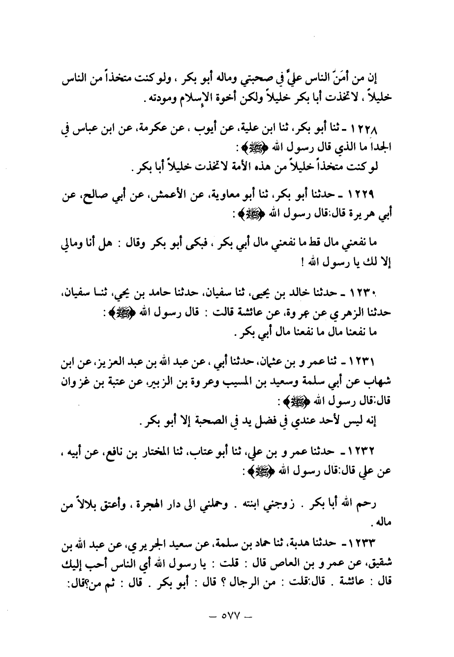 1228 - ثنا أَبُو بَكْرٍ ثنا ابْنُ عُلَيَّةَ عَنْ أَيُّوبَ عَنْ عِكْرِمَةَ عَنِ ابن عباس في الجد ما الَّذِي قَالَ رَسُولُ اللَّهِ صَلَّى اللَّهُ عَلَيْهِ وَسَلَّمَ: "لَوْ كُنْتُ مُتَّخِذًا خَلِيلا مِنْ هَذِهِ الأُمَّةِ لاتَّخَذْتُ خَلِيلا أَبَا بَكْرٍ".