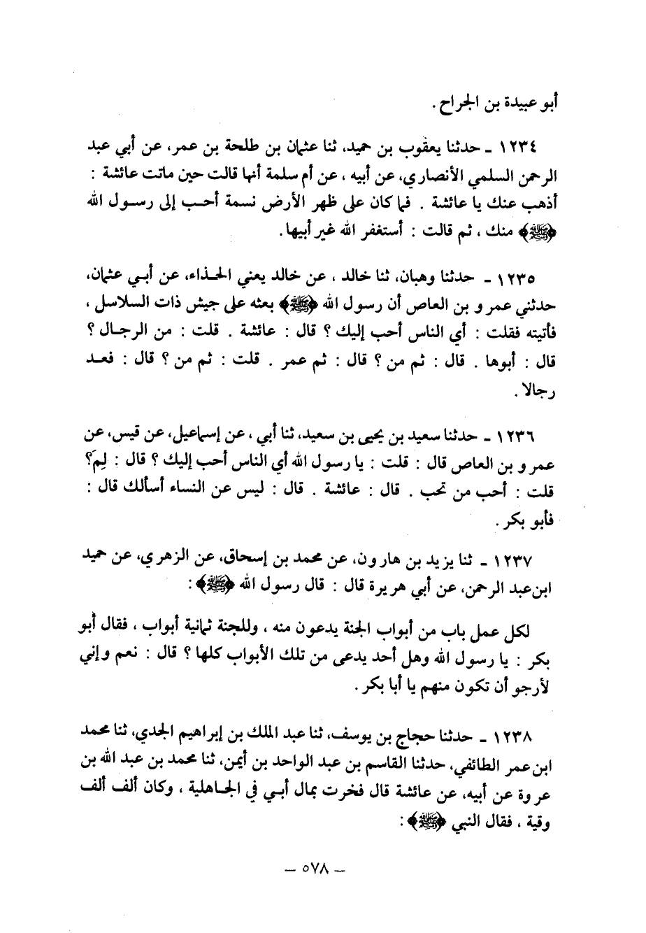 1235 - حدثنا وَهْبَانُ ثنا خَالِدٌ عَنْ خَالِدٍ يَعْنِي الْحَذَّاءَ عَنْ أَبِي عُثْمَانَ حَدَّثَنِي عَمْرُو بْنُ الْعَاصِ أَنّ رَسُولُ اللَّهِ صَلَّى اللَّهُ عَلَيْهِ وَسَلَّمَ بَعَثَهُ عَلَى جَيْشِ ذَاتِ السَّلاسِلِ فَأَتَيْتُهُ فَقُلْتُ: أَيُّ النَّاسِ أَحَبُّ إِلَيْكَ؟ قَالَ: "عَائِشَةُ". قُلْتُ: مِنَ الرِّجَالِ؟ قَالَ: "أَبُوهَا" قَالَ ثُمَّ مَنْ؟ قَالَ: "ثُمَّ عُمَرُ" قُلْتُ: ثُمَّ مَنْ؟ قَالَ: فَعَدَّ رِجَالا.