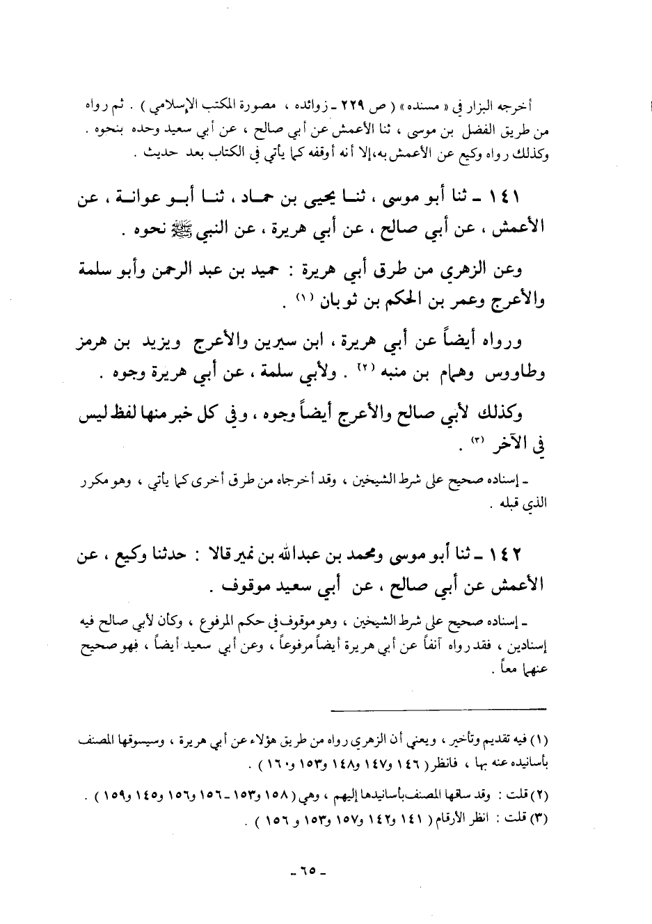 142- ثنا أَبُو مُوسَى وَمُحَمَّدُ بْنُ عبد الله بْنِ نُمَيْرٍ قَالا: حَدَّثَنَا وَكِيعٌ عَنِ الأَعْمَشِ عَنْ أَبِي صَالِحٍ عن أبي سعيد موقوف.