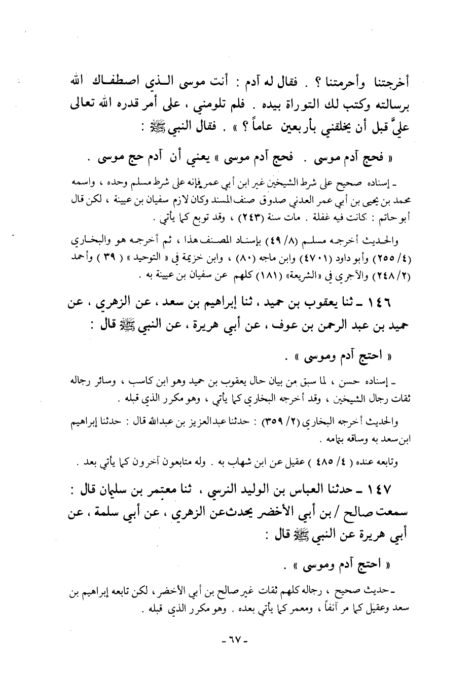 146- ثنا يَعْقُوبُ بْنُ حُمَيْدٍ ثنا إِبْرَاهِيمُ بْنُ سَعْدٍ عَنِ الزُّهْرِيِّ عَنْ حُمَيْدِ بْنِ عَبْدِ الرَّحْمَنِ بْنِ عَوْفٍ عَنْ أَبِي هُرَيْرَةَ عَنِ النَّبِيِّ صَلَّى اللَّهُ عَلَيْهِ وَسَلَّمَ قَالَ: "احْتَجَّ آدَمُ وَمُوسَى".