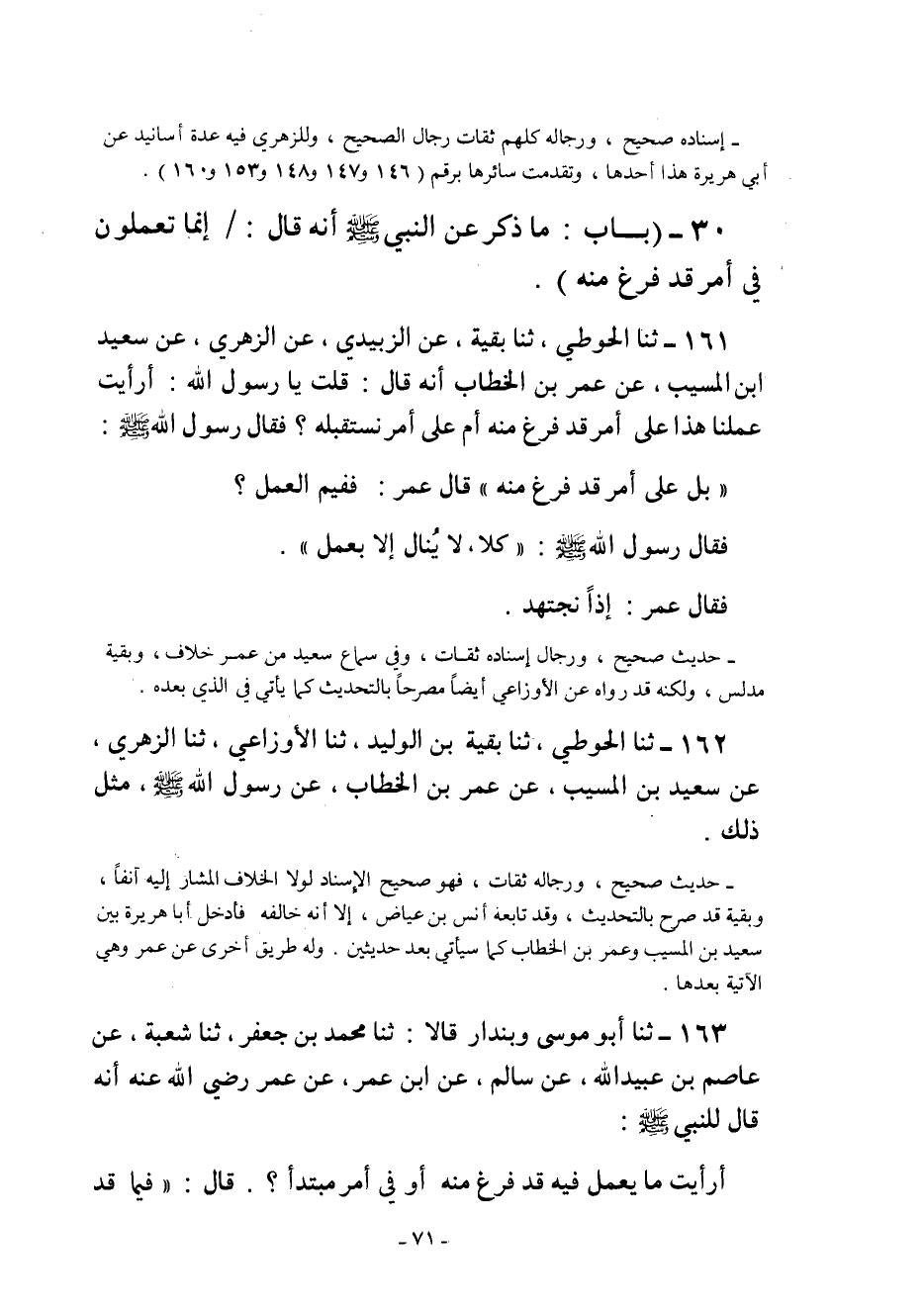 161- ثنا الْحَوْطِيُّ ثنا بَقِيَّةُ عَنْ الزُّبَيْدِيِّ عَنِ الزُّهْرِيِّ عَنْ سَعِيدِ ابن الْمُسَيِّبِ عَنْ عُمَرَ بْنِ الْخَطَّابِ أَنَّهُ قَالَ: قُلْتُ يَا رَسُولَ اللَّهِ: أَرَأَيْتَ عَمَلَنَا هَذَا عَلَى أَمْرٍ قَدْ فُرِغَ مِنْهُ أَمْ عَلَى أَمْرٍ نَسْتَقْبِلُهُ؟ فَقَالَ رَسُولُ اللَّهِ صَلَّى اللَّهُ عَلَيْهِ وَسَلَّمَ: