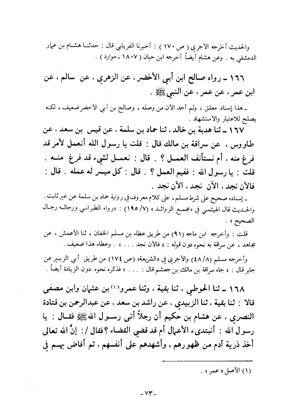 168- ثنا الحوطي ثنا بقية وَثنا عَمْرُو1 بْنُ عُثْمَانَ وَابْنُ مُصَفَّى قَالا: ثنا بَقِيَّةُ ثنا الزُّبَيْدِيُّ عَنْ رَاشِدِ بْنِ سَعْدٍ عَنْ عَبْدِ الرَّحْمَنِ بْنِ قَتَادَةَ النَّصْرِيِّ عَنْ هِشَامِ بْنِ حَكِيمٍ أَنَّ رَجُلا أَتَى رَسُولَ اللَّهِ صَلَّى اللَّهُ عَلَيْهِ وَسَلَّمَ فَقَالَ يا رسول الله: أنبتدىء الأَعْمَالَ أَمْ قَدْ قُضِيَ الْقَضَاءُ؟ فَقَالَ: "إِنَّ اللَّهَ تَعَالَى أَخَذَ ذُرِّيَّةَ آدَمَ مِنْ ظُهُورِهِمْ وَأَشْهَدَهُمْ عَلَى أَنْفُسِهِمْ ثُمَّ أَفَاضَ بِهِمْ في