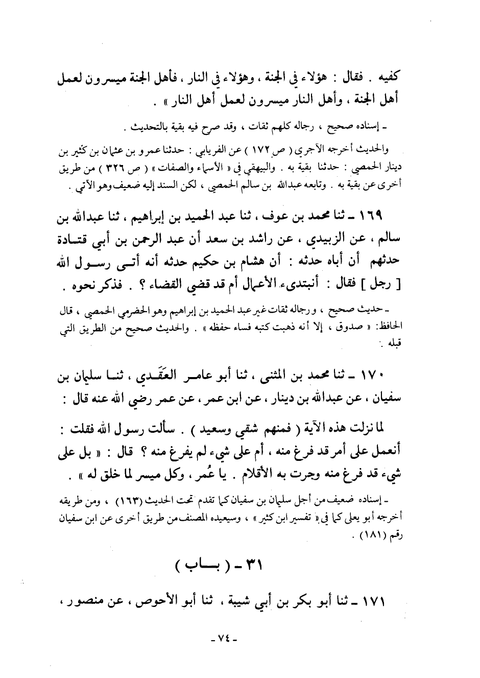 169- ثنا مُحَمَّدُ بْنُ عَوْفٍ ثنا عَبْدُ الْحَمِيدِ بْنُ إِبْرَاهِيمَ ثنا عبد الله بْنُ سَالِمٍ عَنِ الزُّبَيْدِيِّ عَنْ راشد ابن سَعْدٍ أَنَّ عَبْدَ الرَّحْمَنِ بْنَ أَبِي قَتَادَةَ حَدَّثَهُمْ أَنَّ أَبَاهُ حَدَّثَهُ: أَنَّ هِشَامَ بْنَ حَكِيمٍ حَدَّثَهُ أَنَّهُ أَتَى رَسُولَ اللَّهِ رجل فقال: أنبتدىء الأَعْمَالَ أَمْ قَدْ قُضِيَ الْقَضَاءُ؟. فذكر نحوه.