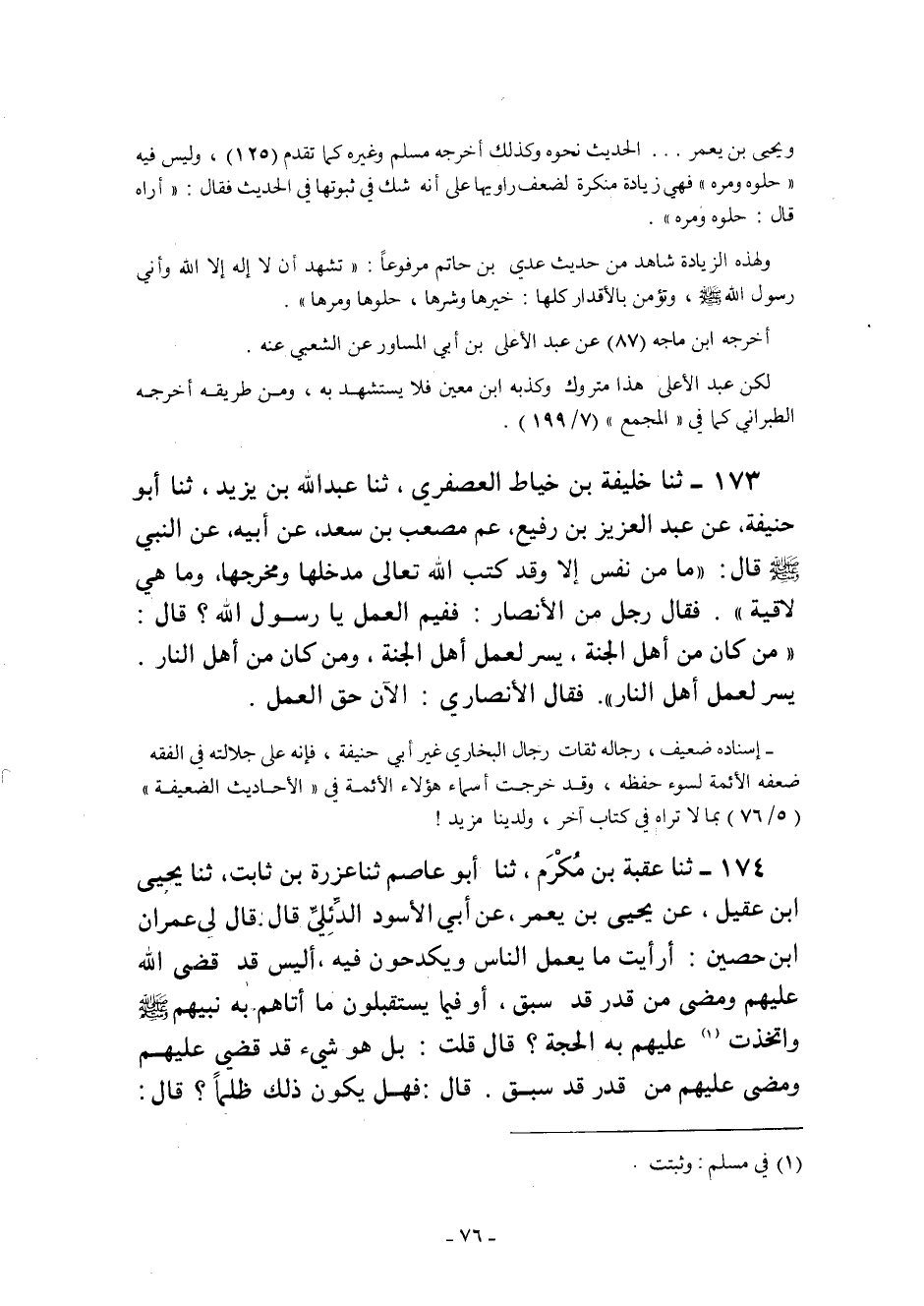 173- ثنا خَلِيفَةُ بْنُ خَيَّاطٍ الْعُصْفُرِيُّ ثنا عبد الله بْنُ يَزِيدَ ثنا أَبُو حَنِيفَةَ عَنْ عَبْدِ الْعَزِيزِ بْنِ رُفَيْعٍ عم مصعب بْنِ سَعْدٍ عَنِ النَّبِيِّ صَلَّى اللَّهُ عَلَيْهِ وَسَلَّمَ قَالَ: "مَا مِنْ نَفْسٍ إِلا وَقَدْ كَتَبَ اللَّهُ تَعَالَى مَدْخَلَهَا وَمَخْرَجَهَا وَمَا هِيَ لاقِيَةٌ" فَقَالَ رَجُلٌ مِنَ الأَنْصَارِ: فَفِيمَ الْعَمَلُ يَا رَسُولَ اللَّهِ؟ قَالَ: "مَنْ كَانَ مِنْ أَهْلِ الْجَنَّةِ, يُسِّرَ لِعَمَلِ أَهْلِ الْجَنَّةِ, وَمَنْ كَانَ مِنْ أَهْلِ النَّارِ, يُسِّرَ لِعَمَلِ أَهْلِ النَّارِ". فَقَالَ الأَنْصَارِيُّ: الآنَ حَقَّ الْعَمَلُ.