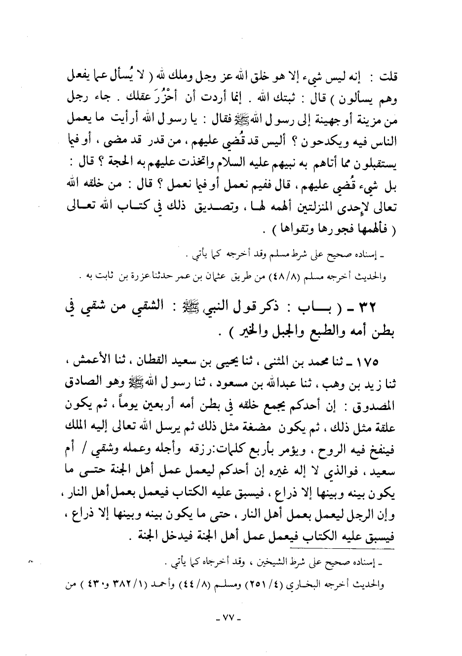 175- ثنا مُحَمَّدُ بْنُ الْمُثَنَّى ثنا يَحْيَى بْنُ سَعِيدٍ الْقَطَّانُ ثنا الأَعْمَشُ ثنا زَيْدُ بن وهب ثنا عبد الله بْنُ مَسْعُودٍ ثنا رَسُولُ اللَّهِ صَلَّى اللَّهُ عَلَيْهِ وَسَلَّمَ وَهُوَ الصَّادِقُ الْمَصْدُوقُ: "إِنَّ أَحَدَكُمْ يُجْمَعُ خَلْقُهُ فِي بَطْنِ أُمِّهِ أَرْبَعِينَ يَوْمًا ثُمَّ يَكُونُ عَلَقَةً مِثْلَ ذَلِكَ ثُمَّ يَكُونُ مُضْغَةً مِثْلَ ذَلِكَ ثُمَّ يُرْسِلُ اللَّهُ تَعَالَى إِلَيْهِ الْمَلَكَ فَيَنْفُخُ فِيهِ الرُّوحَ وَيُؤْمَرُ بِأَرْبَعِ كَلِمَاتٍ رِزْقِهِ وَأَجَلِهِ وَعَمَلِهِ وَشَقِيٍّ أَمْ سَعِيدٍ فَوَالَّذِي لا إِلَهَ غَيْرُهُ إِنَّ أَحَدَكُمْ لَيَعْمَلُ عَمَلَ أَهْلِ الْجَنَّةِ حَتَّى مَا يَكُونَ بَيْنَهُ وَبَيْنَهَا إِلا ذِرَاعٌ فَيَسْبِقُ عَلَيْهِ الْكِتَابُ فَيَعْمَلُ بِعَمَلِ أَهْلِ النَّارِ وَإِنَّ الرَّجُلَ لَيَعْمَلُ بِعَمَلِ أَهْلِ النَّارِ حَتَّى مَا يَكُونَ بَيْنَهُ وَبَيْنَهَا إِلا ذِرَاعٌ فَيَسْبِقُ عَلَيْهِ الْكِتَابُ فَيَعْمَلُ على أهل الجنة فيدخل الجنة".