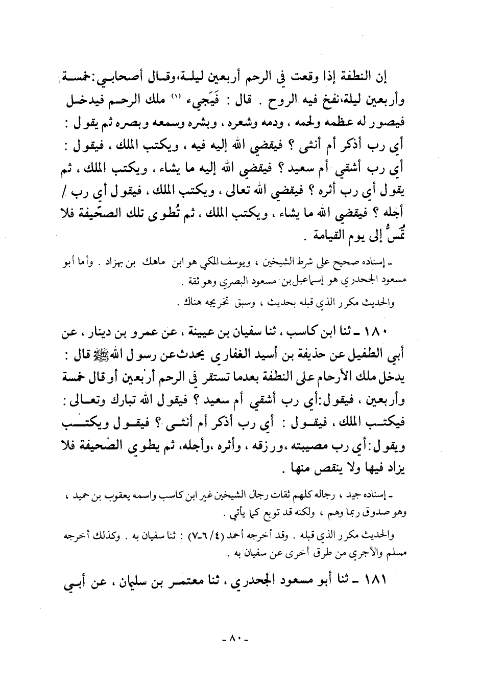 180- ثنا ابْنُ كَاسِبٍ ثنا سُفْيَانُ بْنُ عُيَيْنَةَ عَنْ عَمْرِو بْنِ دِينَارٍ عَنْ أَبِي الطُّفَيْلِ عَنْ حُذَيْفَةَ بْنِ أُسَيْدٍ الْغِفَارِيِّ عَنْ رَسُولُ اللَّهِ صَلَّى اللَّهُ عَلَيْهِ وَسَلَّمَ قَالَ: "يَدْخُلُ مَلَكُ الأَرْحَامِ عَلَى النُّطْفَةِ بَعْدَمَا تَسْتَقِرُّ فِي الرَّحِمِ أَرْبَعِينَ أَوْ قَالَ خَمْسَةً وَأَرْبَعِينَ فَيَقُولُ أَيْ رَبِّ أَشَقِيٌّ أَمْ سَعِيدٌ فَيَقُولُ اللَّهُ تَبَارَكَ وَتَعَالَى فَيَكْتُبُ الْمَلَكُ فَيَقُولُ أَيْ رَبِّ أَذَكَرٌ أَمْ أُنْثَى فَيَقُولُ وَيَكْتُبُ وَيَقُولُ أَيْ رَبِّ مُصِيبَتُهُ وَرِزْقُهُ وَأَثَرُهُ وَأَجَلُهُ ثُمَّ يَطْوِي الصَّحِيفَةَ فَلا يُزَادُ فِيهَا وَلا ينقص منها".