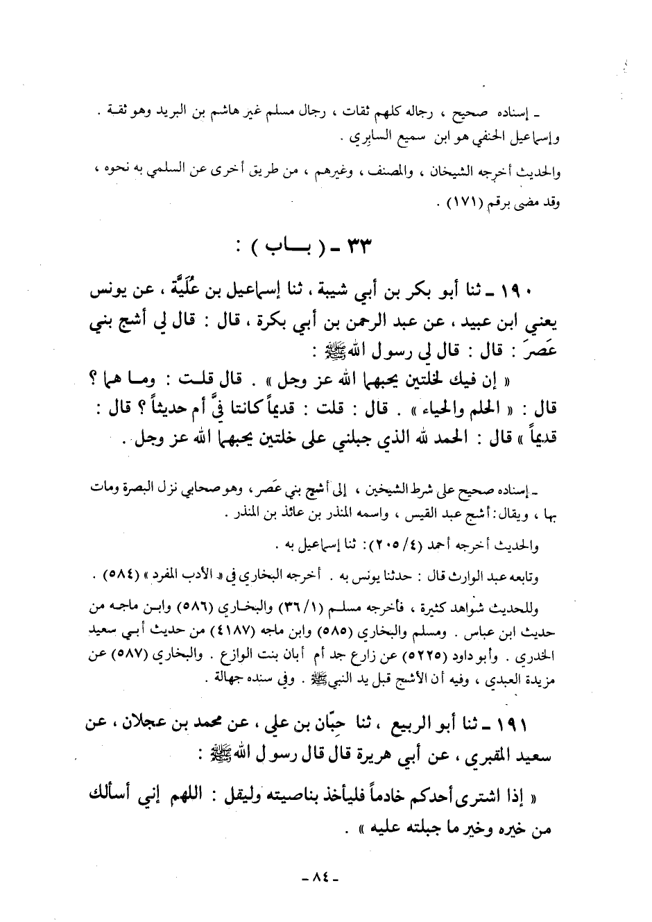 190- ثنا أَبُو بَكْرِ بْنُ أَبِي شَيْبَةَ ثنا إِسْمَاعِيلُ بْنُ عُلَيَّةَ عَنْ يُونُسَ يَعْنِي ابْنَ عبيد عن عبد الرحمن ابن أَبِي بَكْرَةَ قَالَ: قَالَ لِي أشج بني عَصْرٍ: قَالَ: قَالَ لِي رَسُولُ اللَّهِ صَلَّى اللَّهُ عَلَيْهِ وَسَلَّمَ: