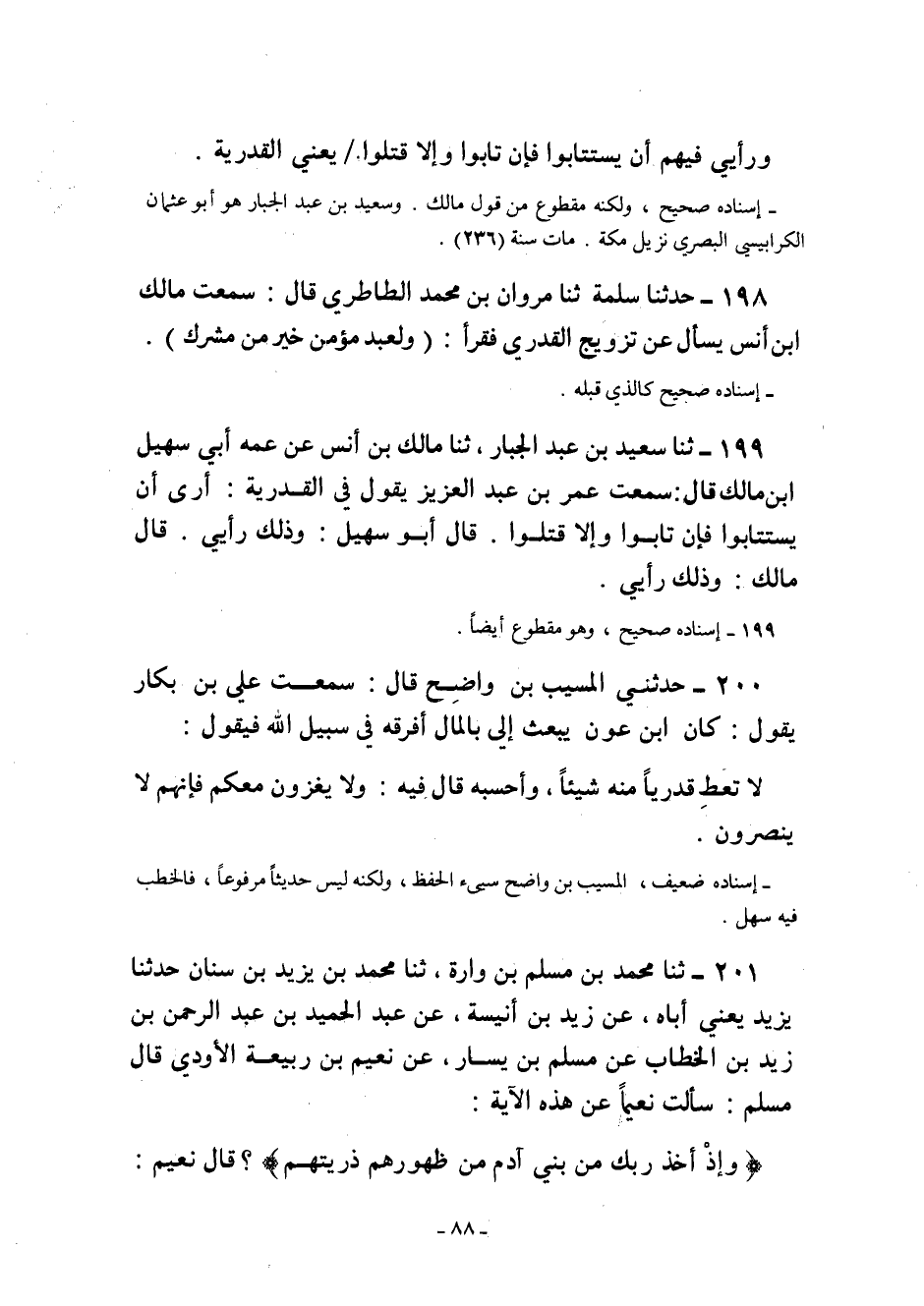199- ثنا سَعِيدُ بْنُ عَبْدِ الْجَبَّارِ ثنا مَالِكُ بْنُ أَنَسٍ عَنْ عمه أبي سهيل ابن مَالِكٍ قَالَ: سَمِعْتُ عُمَرَ بْنَ عَبْدِ الْعَزِيزِ يَقُولُ فِي الْقَدَرِيَّةِ: أَرَى أَنْ يُسْتَتَابُوا فَإِنْ تَابُوا وَإِلا قُتِلُوا. قَالَ أَبُو سُهَيْلٍ: وَذَلِكَ رَأْيِي. قَالَ مَالِكٌ: وَذَلِكَ رأيي.