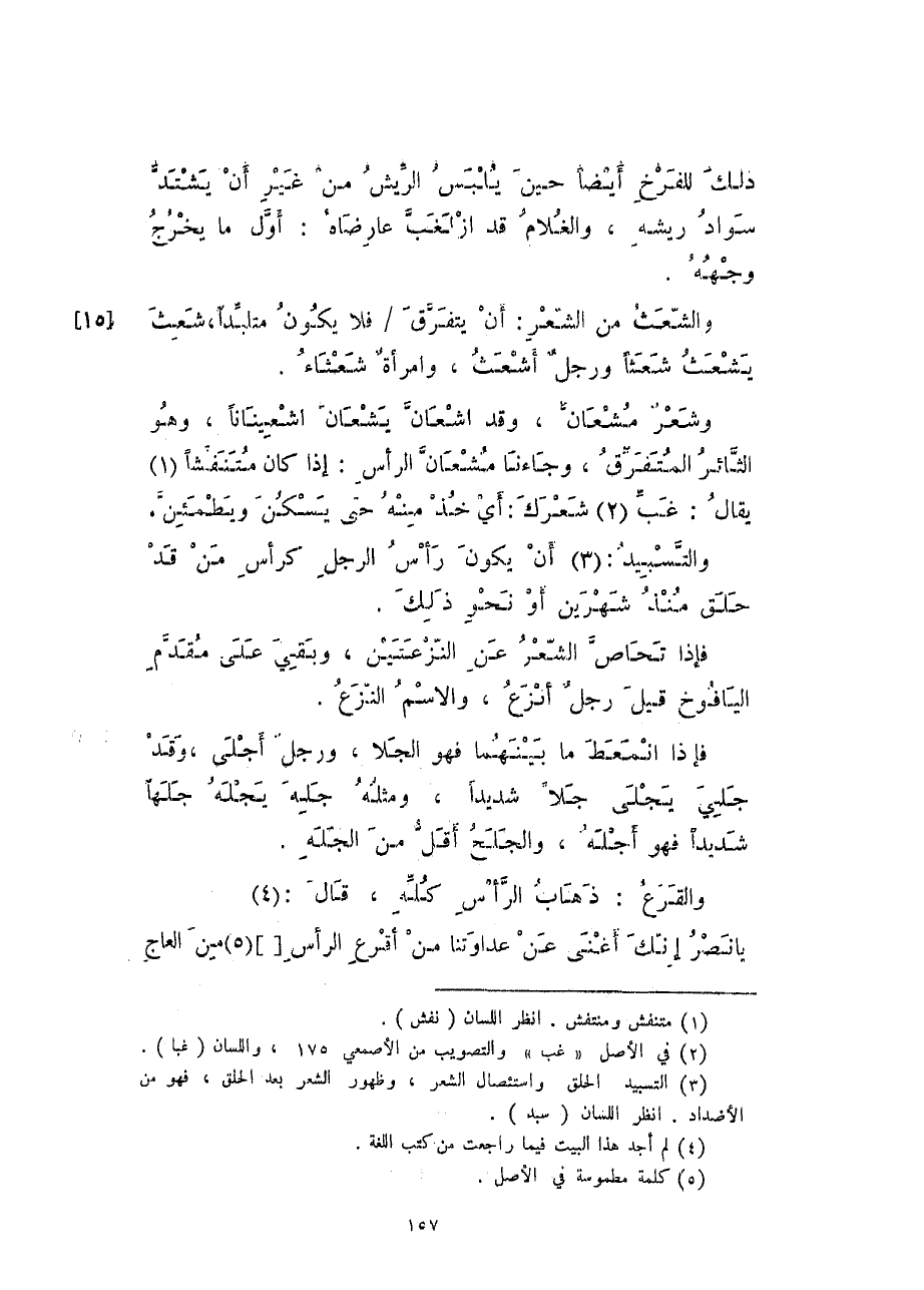 وشعرٌ مشعان، وقد اشعانّ يشعان اشعيناناً، وهو الثائر المتفرق، وجاءنا مشعانّ الرأس: إذا كان متنفشاً يقال: غبّ شعرك: أي خذ منه حتى يسكن ويطمئن.