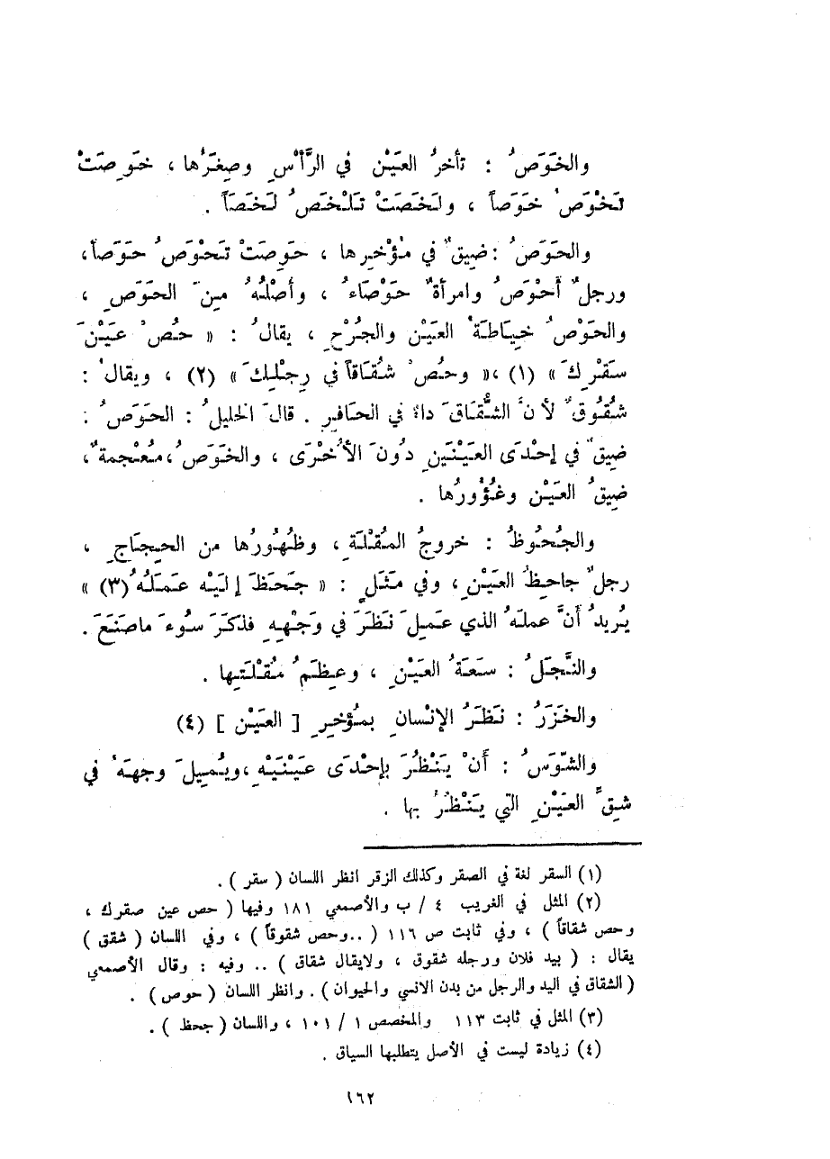 والحوص: ضيقٌ في مؤخرها، حوصت تحوص حوصاً، ورجلٌ أحوص وامرأةٌ حوصاء، وأصله من الحوص، والحوص خياطة العين والجرح، يقال: "حص عين سقركَ"، "وحص شقاقاً في رجلك"، ويقال: شقوقٌ لأن الشقاق داءٌ في الحافر. قال الخليل: الحوص: ضيقٌ في إحدى العينين دون الأخرى، والخوص، معجمةٌ، ضيق العين وغؤورها.