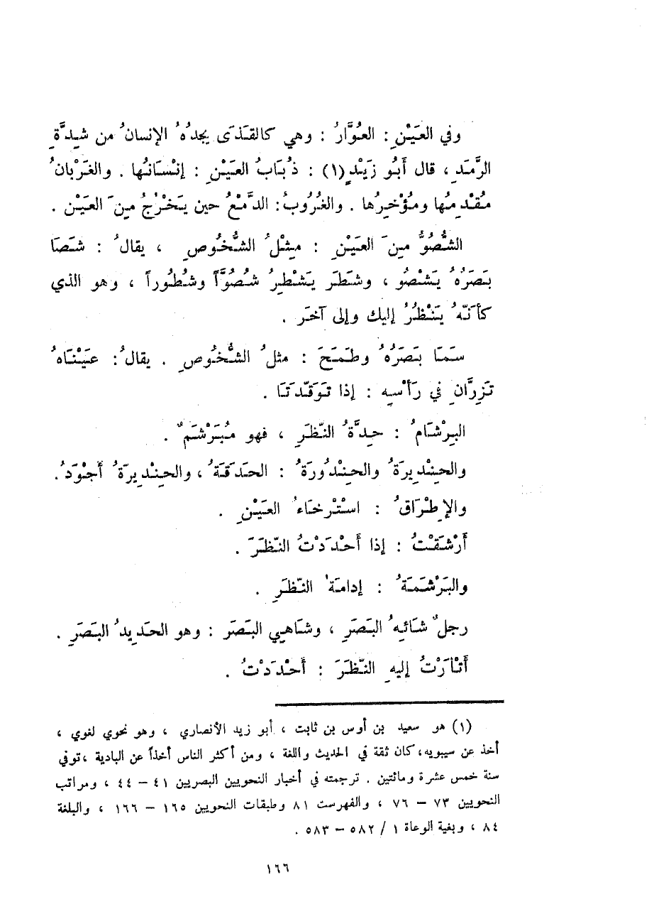 وفي العين: العوّار: وهي كالقذى يجده الإنسان من شدة الرمد، قال أبو زيدٍ: ذباب العين: إنسانها. والغربان مقدمها ومؤخرها. والغروب: الدمع حين يخرج من العين.