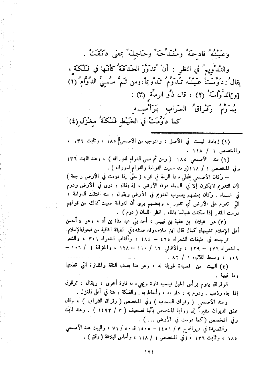 والتدويم في النظر: أن تدوّر الحدقة كأنها في فلكةٍ، يقال: دوّمت عينه تدوّم تدويماً، ومن ثمّ سمي الدوّام والدّوامة، قال ذو الرمّة: