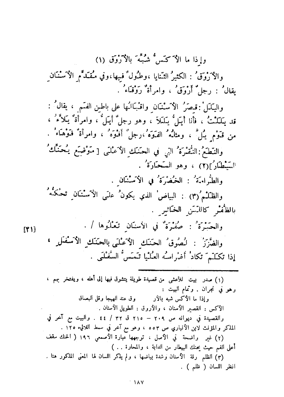 واليلل: قصر الأسنان وإقبالها على باطن الفم، يقال: قد يللت، فأنا أيلُّ يللا، وهو رجلٌ أيلُّ، وامرأةٌ يلاّء، من قومٍ يلٍّ، ومثله الفوه، رجلٌ أفوه، وامرأةٌ فوهاء.