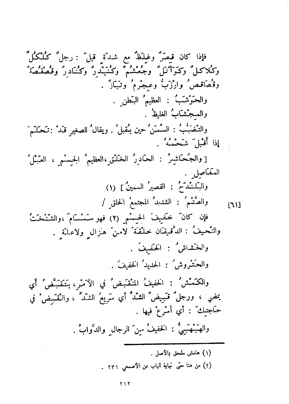 فإذا كان قصرٌ وغلظٌ مع شدة قيل: رجلٌ كلكلٌ وكلاكلٌ وكوأللٌ وجعشمٌ وكنيدرٌ وكنادرٌ وقصقصةٌ وقصاقص وأرزبٌ وعجرمٌ وتيّازٌ.