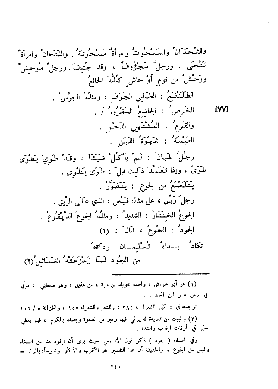 والشحذان والمسحوت وامرأةٌ مسحوتةٌ. واللتحان وامرأةٌ لتحى. ورجلٌ مجؤوفٌ، وقد جئف. ورجلٌ موحشٌ ووحشٌ من قومٍ أو حاشٍ كله الجائع.