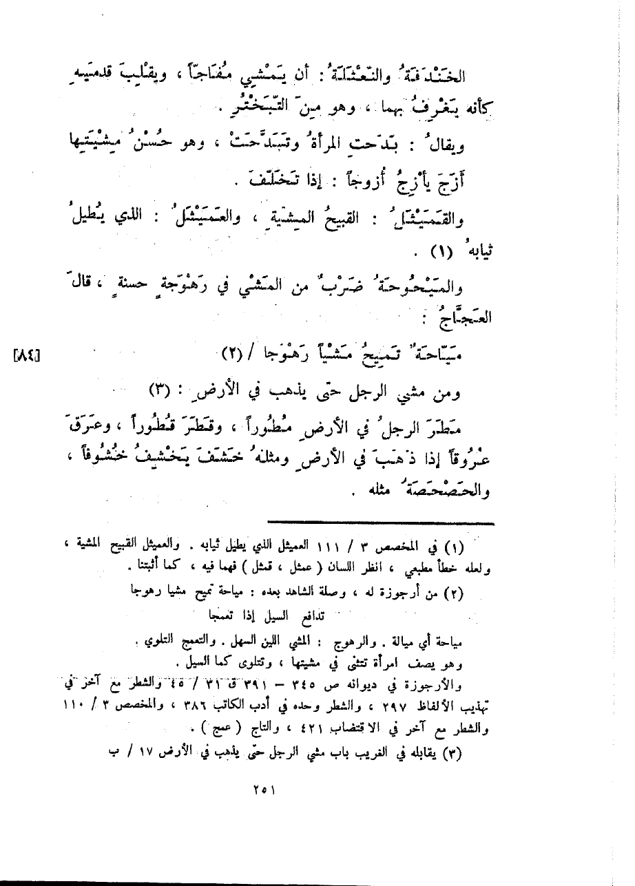 ومن مشي الرجل حتى يذهب في الأرض: مطر الرجل في الأرض مطوراً، وقطر قطوراً، وعرق عروقاً إذا ذهب في الأرض ومثله خشف يخشف خشوفاً، والحصحصة مثله.