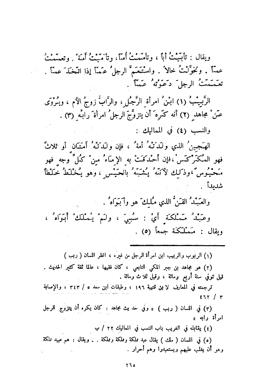 ويقال: تأبيت أباً، وتأممت أماً، وتأميت أمةً. وتعممت عماً. وتخولت خالاً. واستعمّ الرجل عماً إذا اتخذ عماً.