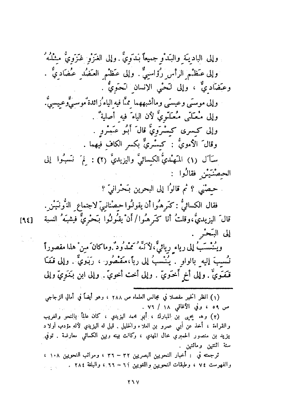 سأل المهدي الكسائي واليزيدي: لم نسبوا إلى الحصنين فقالوا: حصني؟ ثم قالوا إلى البحرين بحراني؟ فقال الكسائي: كرهوا أن يقولوا حصاني لاجتماع النونين.