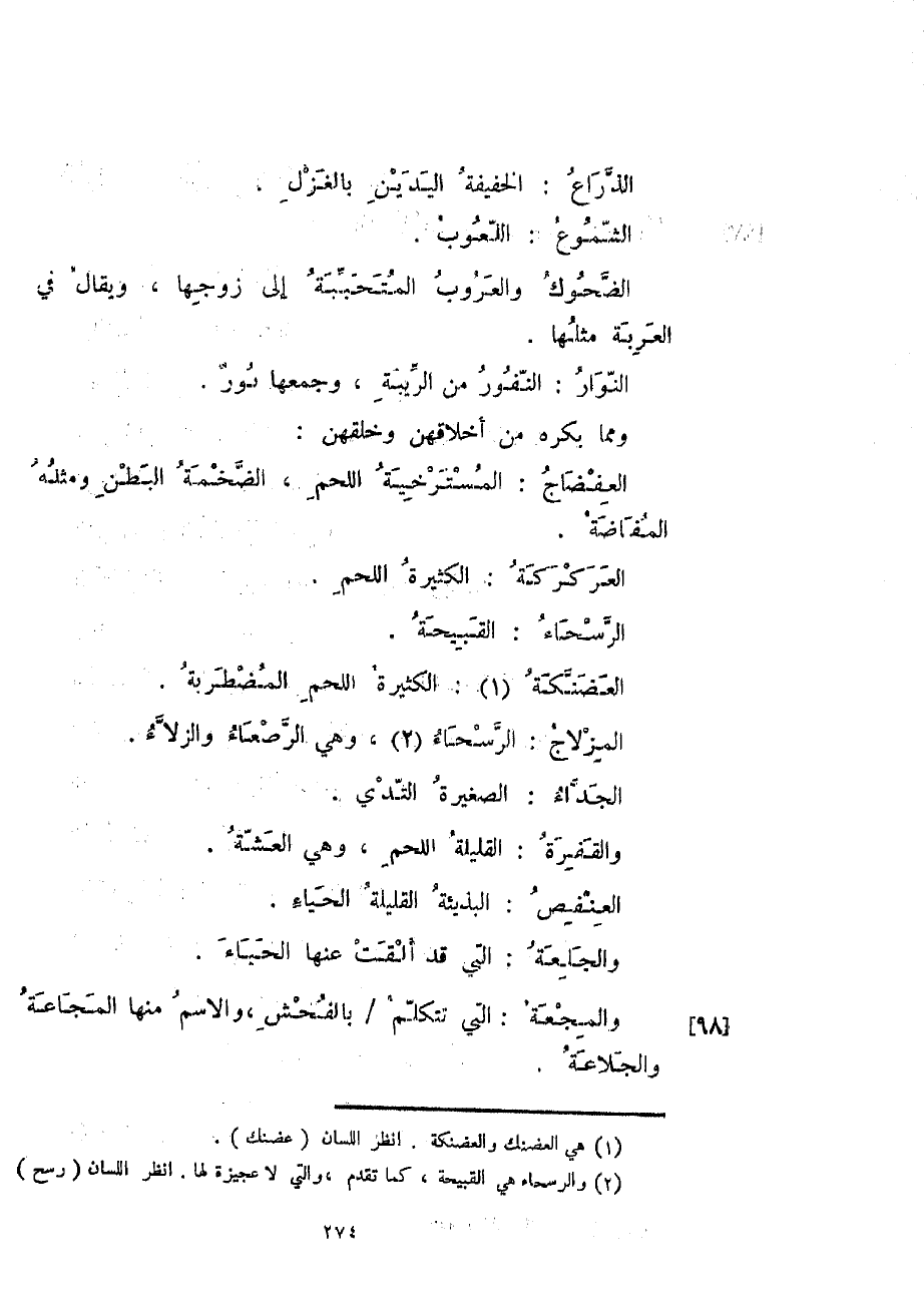 ومما يكره من أخلاقهن وخلقهن: العفضاج: المسترخية اللحم، الضخمة البطن ومثله المفاضة.