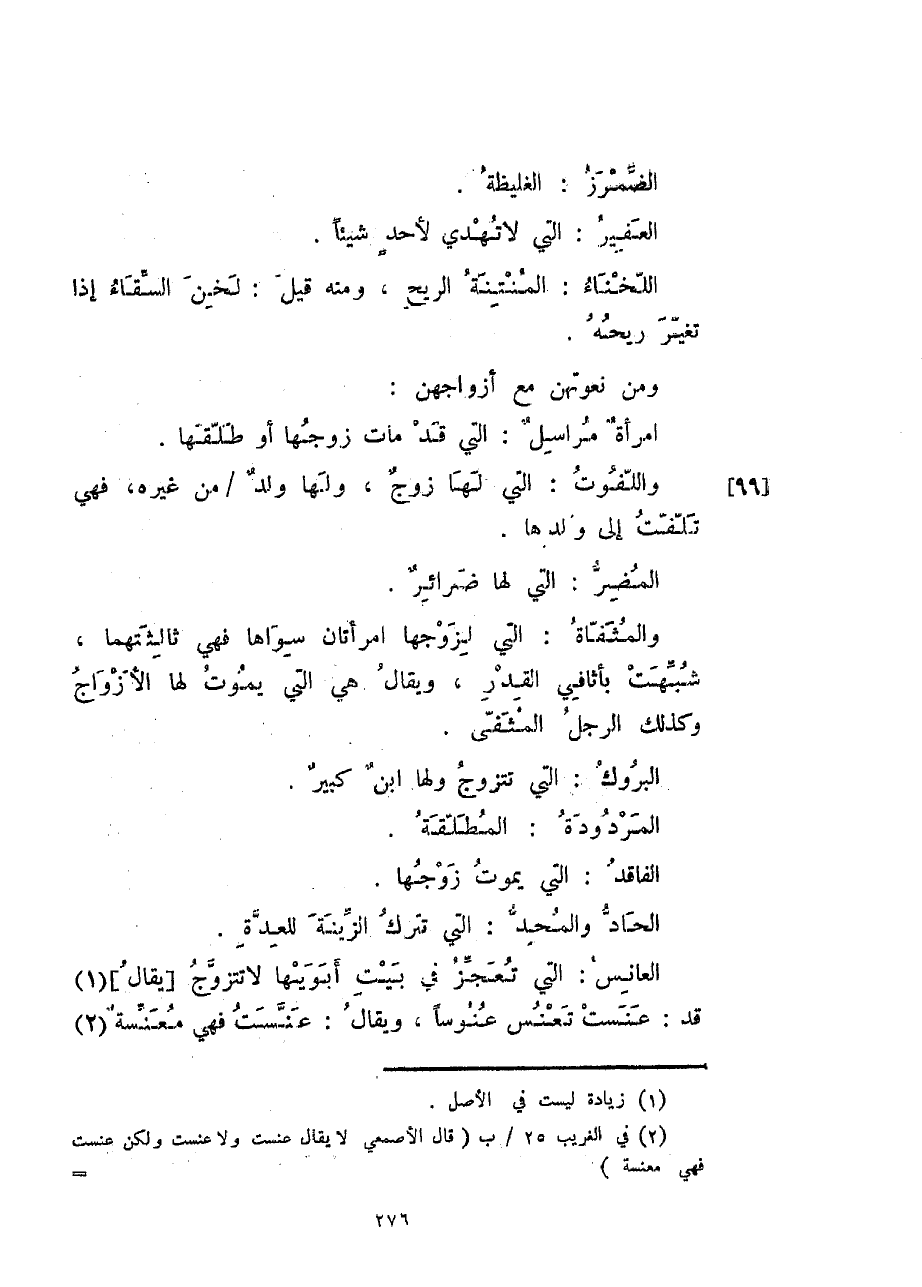 ومن نعوتهن مع أزواجهن: امرأةٌ مراسلٌ: التي قد مات زوجها أو طلقها.