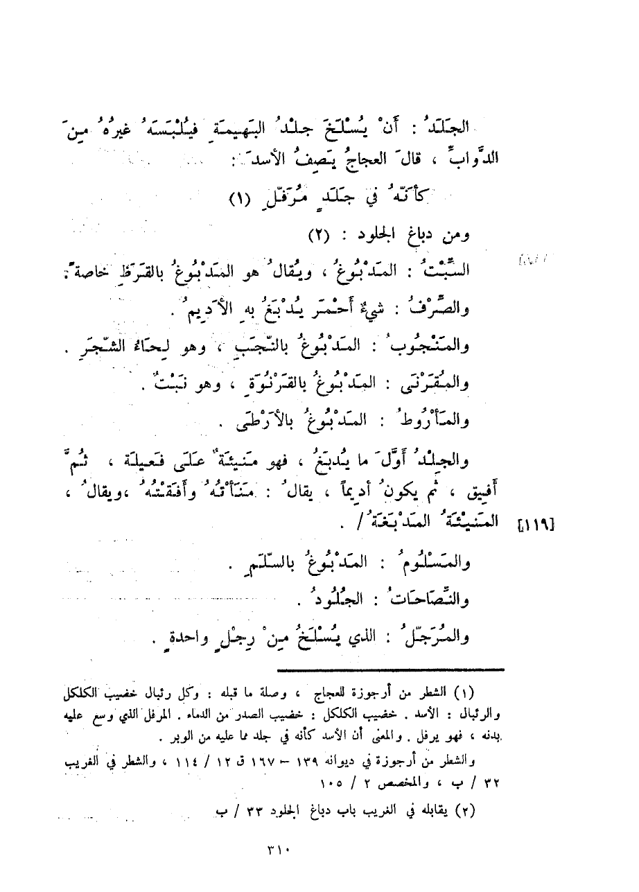 ومن دباغ الجلود: السبت: المدبوغ، ويقال هو المدبوغ بالقرظ خاصةً.