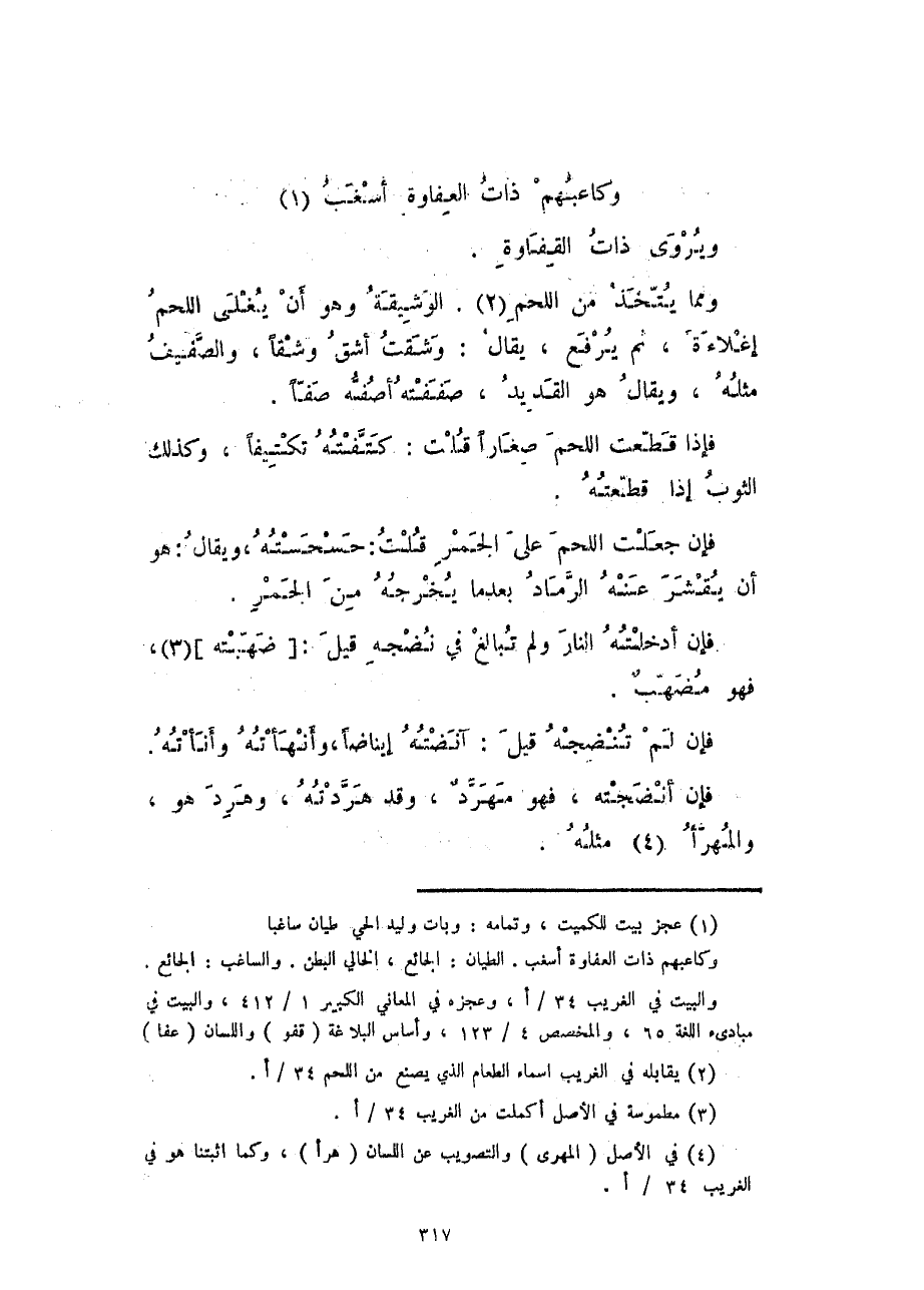ومما يتخذ من اللحم. الوشيقة وهو أن يغلى اللحم إغلاءة، ثم يرفع، يقال: وشقت أشق وشقاً، والصّفيف مثله، ويقال هو القديد، صففته أصفه صفاً.