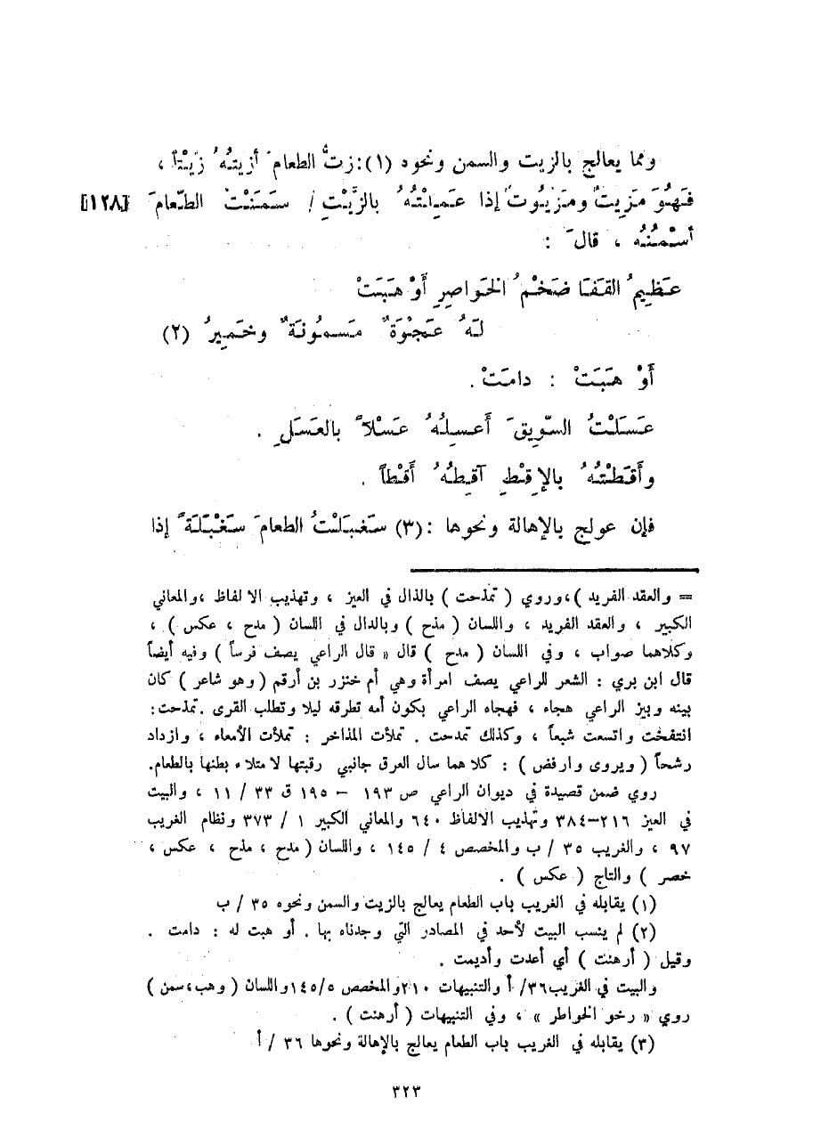 ومما يعالج بالزيت والسمن ونحوه: زتّ الطعام أزيته زيتاً، فهو مزيتٌ ومزيوتٌ إذا عملته بالزيتسمنت الطعام أسمنه، قال: