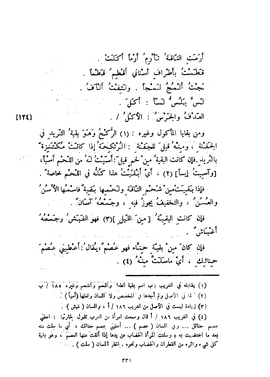 ومن بقايا المأكول وغيره: الركح وهو بقية الثريد في الجفنة، ومنه قيل للجفنة: المرتكحة إذا كانت مكتنزة بالثريد. فإن كانت البقية من لحمٍ قيل: أسيت له من اللحم أسياً، وآسيت إيساً، أي أبقيت هذا كله في اللحم خاصةً.