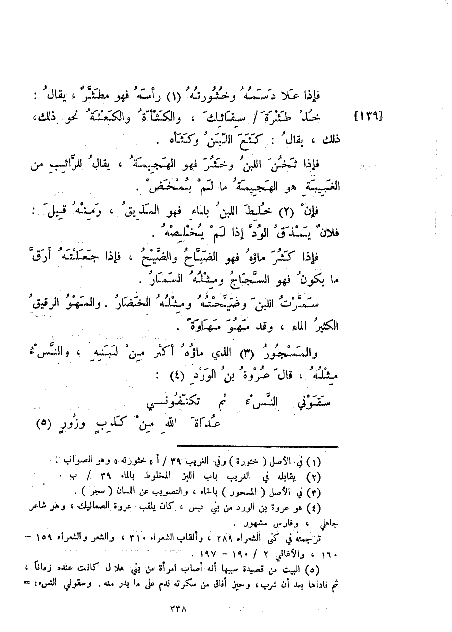 فإذا علا دسمه وخثورته راسه فهو مطشّرٌ، يقال: خذ طثرة سقائك، والكثأة والكعثة نحو ذلك، يقال: كثع اللبن وكثأه.