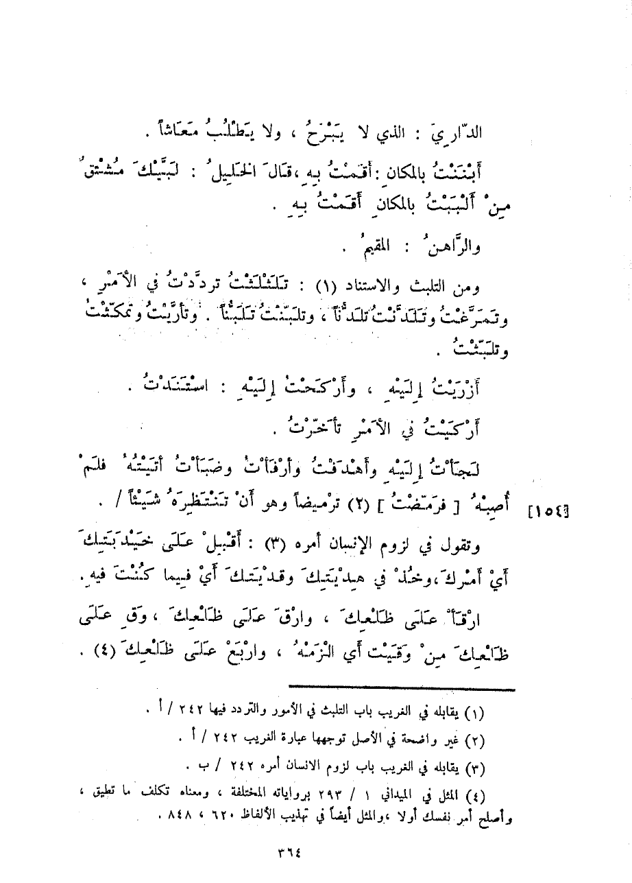 ومن التلبث والاستناد: تلثلثت ترددت في الأمر، وتمرّغت وتلدّنت تلدّناً، وتلبنت تلبّناً، وتأرّيت وتمكثت وتلّبثت.