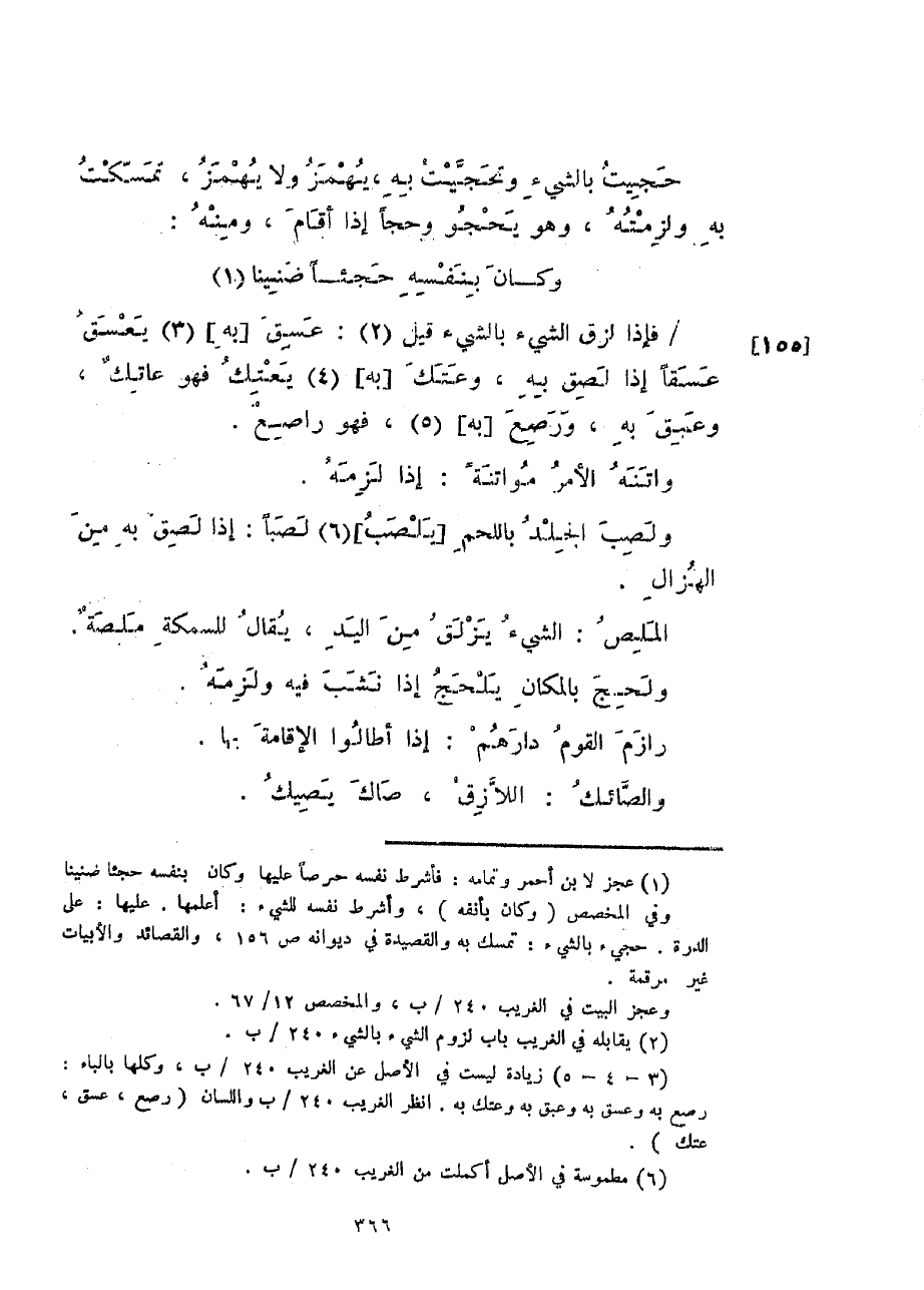 فإذا لزق بالشيء قيل: عسق به يعسق عسقاً إذا لصق به، وعتك به يعتك فهو عاتكٌ، وعبق به، ورصع به، فهو راصعٌ.