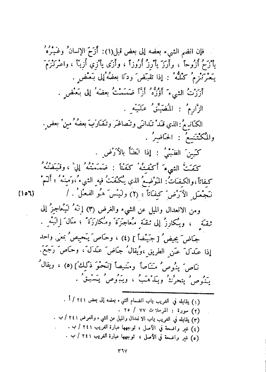 فإن انضم الشيء بعضه إلى بعض قيل: أزح الإنسان وغيره يأزح أزوحاً، وأرز يأرز أروزاً، وأزّى يأزي أزيّاً، واعرنزم يعرنزم كله: إذا تقبض ودنا بعضه إلى بعضٍ.