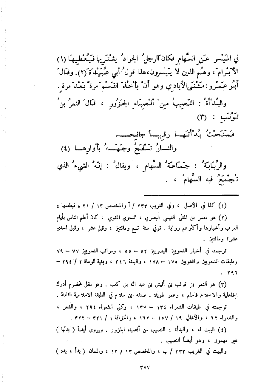 في الميسر عن السهام فكان الرجل الجواد يشتريها فيعطيها الأبرام، وهم الذين لا ييسرون، هذا قول أبي عبيدة. وقال أبو عمرو: مثنى الأيادي وهو أن يأخذ القسم مرةً بعد مرةٍ.